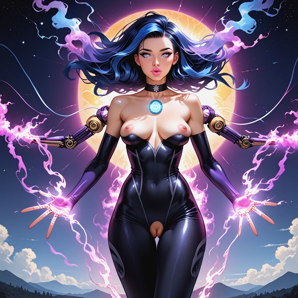 Gwen Tennyson, flying through milky way, among the stars, (floating in zero gravity:0.63), purple cosmic aura, (aura body:1.3), (radiation limbs:1.3), (sun head:1.3), flying from planets to planet, stars and moona around, pure white eyes, (veryvery longglowing purple burning hair:1.3), (full bimbo lips:1.3), (slimbody:1.3), (extremely tight body:1.3), perfect breasts, parted cleavage, (sagging breast:1.1), spread breasts, (swooping breasts:1.1), hanging verynarrowbreasts, pink puffy nipples, (perky breasts:0.7), rounded bottom breasts, (retrousse breasts:1.1), (puffy pussy:1.3), very long legged
