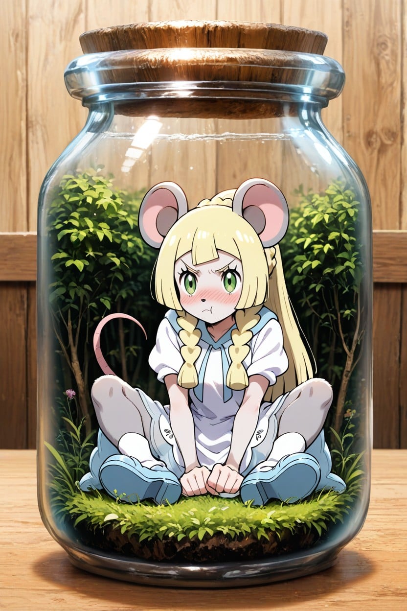 Lillie from pokemon, wearing lillie from pokemon clothing, furry, anthro mouse, grey fur, furry body, fluffy body, covered in grey fur, anthro mouse, mouse ears, mouse tail, stuck inside jar, sitting legs spread, lillie inside jar, jar on wooden table, body the size of a mouse, soft blush, pouting, beautiful face, soft face, smooth face, giant home interior background, giant environment, giant objects in background, inside modern home, full body shot