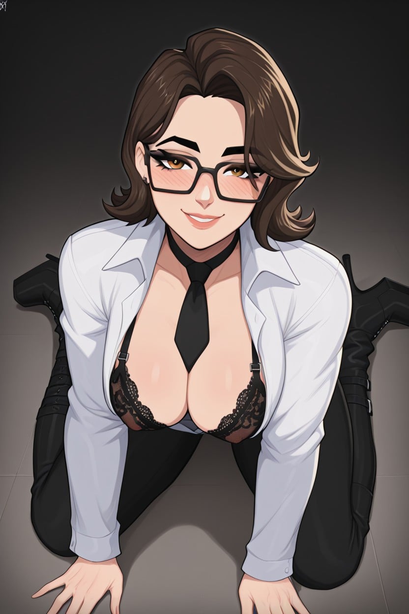 Maven Fortnite, Fortnite, brunette hair, glasses, big thick rimmed glasses, dark eyebrows, latina, long eyelashes, white shirt and tie, big breasts, open shirt, exposed breasts, black lace lingerie, exposed bra, platform boots, horny, black lace panties, high heeled military boots, nerdy, nerd looking, perfect body, fit, detailed face, detailed lingerie, smiling