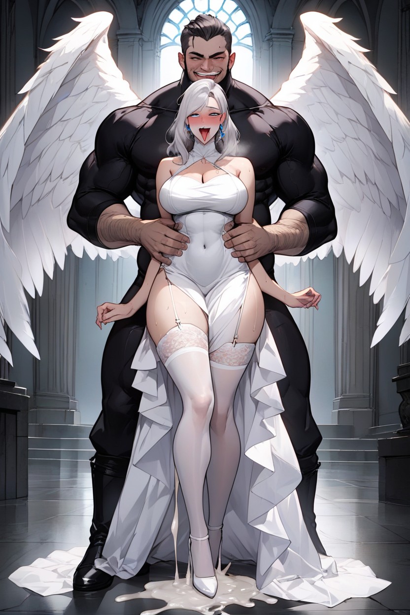 pale angel woman fucked by fat black hairy man, massive gigantic dick, nonconservative, submissive, sweaty, by the size of cock, tight dress, huge natural boobs, passionate sex, woman bend over, black demon fucking her from behind aggressively, full body image, heels, he is grabbing her waist, gorgeous, strong orgasm, eyes rolled, head up, excessive cum, cum puddle, place, wide hips, big ass, round ass, clothed, white dress, dress, white heels, white stockings, stockings, angel wings, dress