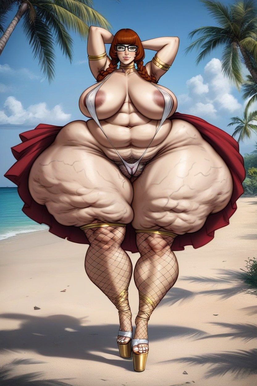 velma dinkley from scooby doo, anime face, abs, pale skin, (huge hyper ass:1.3), saggy breasts, inverted nipples, (hyper thighs:1.3), long legs, tall, bottom heavy, goddess slingshot bikini, camel toe, breast veins, (cutie: 1.3), sunset beach, braided pixie hair, cellulite, veins on thighs, platform sandals, fishnet stockings, belly dancer, detailed feet, white nails, fat vagina, drawn in legoman art style, buttplug, toe ring, long toe nails, detailed toes, presenting feet