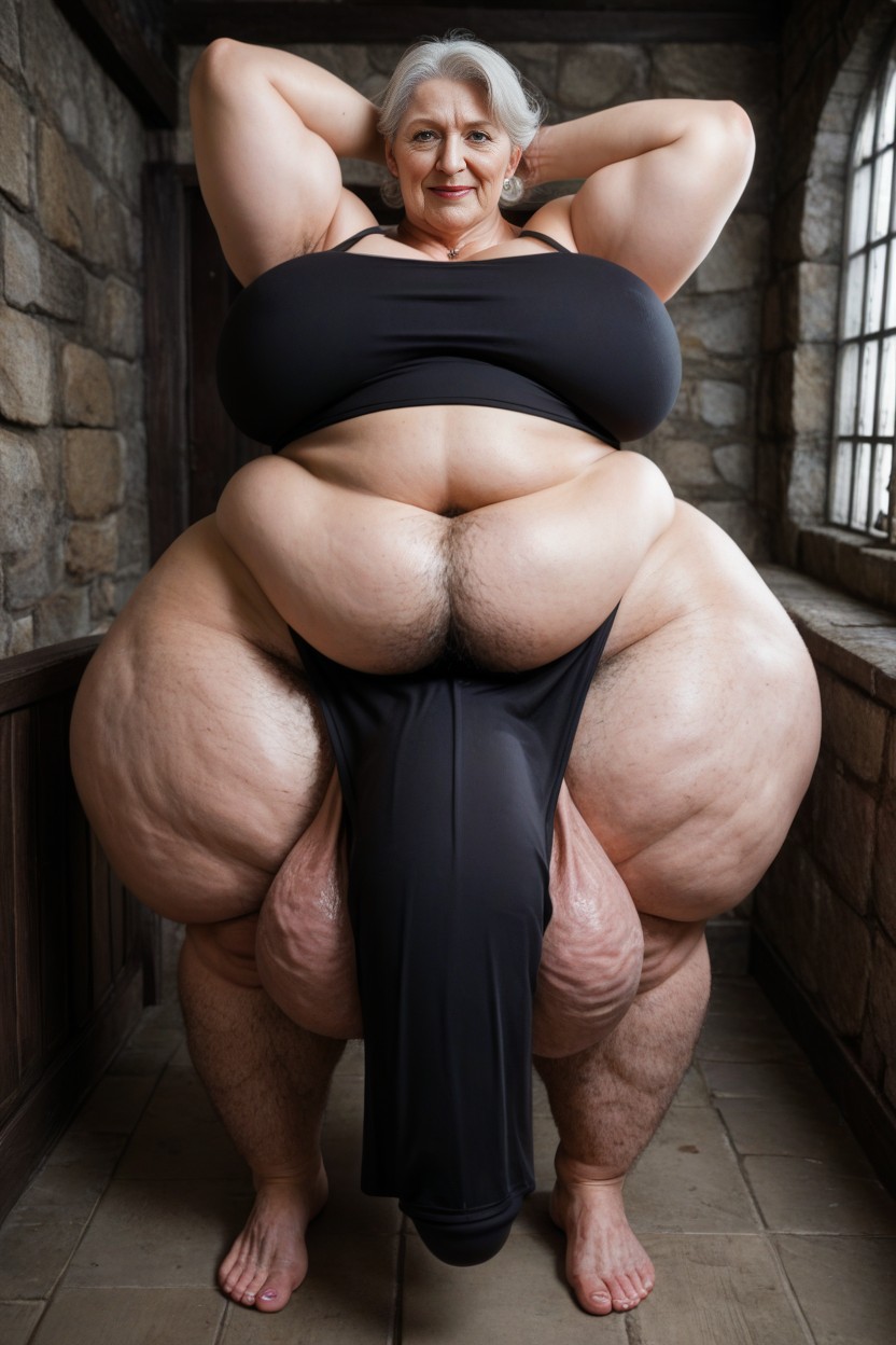 fully clothed, hyper hairy chest hair extremely massive long bulge through clothing, gigantic saggy breast, really long legs, big belly, (hyper length legs 1.6 hyper testicals: 1.1), hyper saggy balls, cellulite legs, cellulite arms, (foreskin: 1.3 standing in dungeon), thigh highs, dungeon background, large hips, black tank top, black stockings, hairy arms hairy shoulders no shoeshairy legs hairy legs hairy thighs legs covered in hair veiny forearms extremely vascular arms extremely vascular legs hyper penis hyper wide penis large veiny calves, hyper pubic hair, white hair, extremely hair, giant tall futanari, extreme cellulite hairy feet like a hobbit, hairy feet hairy ankles hairy bushy thighs like a sasquatch, hairy legs pale skinveiny feet, veiny legs veiny arms hairy legs