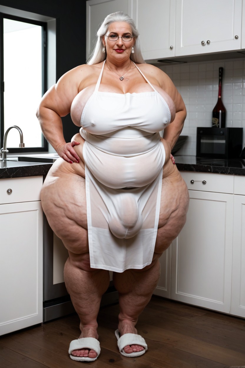 fully clothed, (large long bulge through clothing : 1.3), gigantic saggy breast, (obese: 1.3), ssbbw gigantic lady, big belly, plump lips, massive huge flaccid hyper bulge, extremely white hair, mature wrinkled face, loose black cotton pants, thick cock covered by black loose fitted pants, black baggy pants, standing in kitchen on thanksgiving, thanksgiving feast, thanksgiving apron, detailed bulge, full cock outline, white slippers, holding cookie pan, long course white hair, futunari, boobs, massive ass, large hyper hips, thick thighs, milf, gigantic ass, hairy legs pale skin, hairy legs pale skin, veiny feet veiny legs veiny arms hairy legs hairy thighs legs covered in hair, extremely long lengthy legs plump lips, extremely fat obese body, cellulite skin, cellulite saggy body, hyper obesity, obese flabby fat, hyper thick thighs, fat thighs, fat cellulite legs, cellulite arms, fat saggy arms