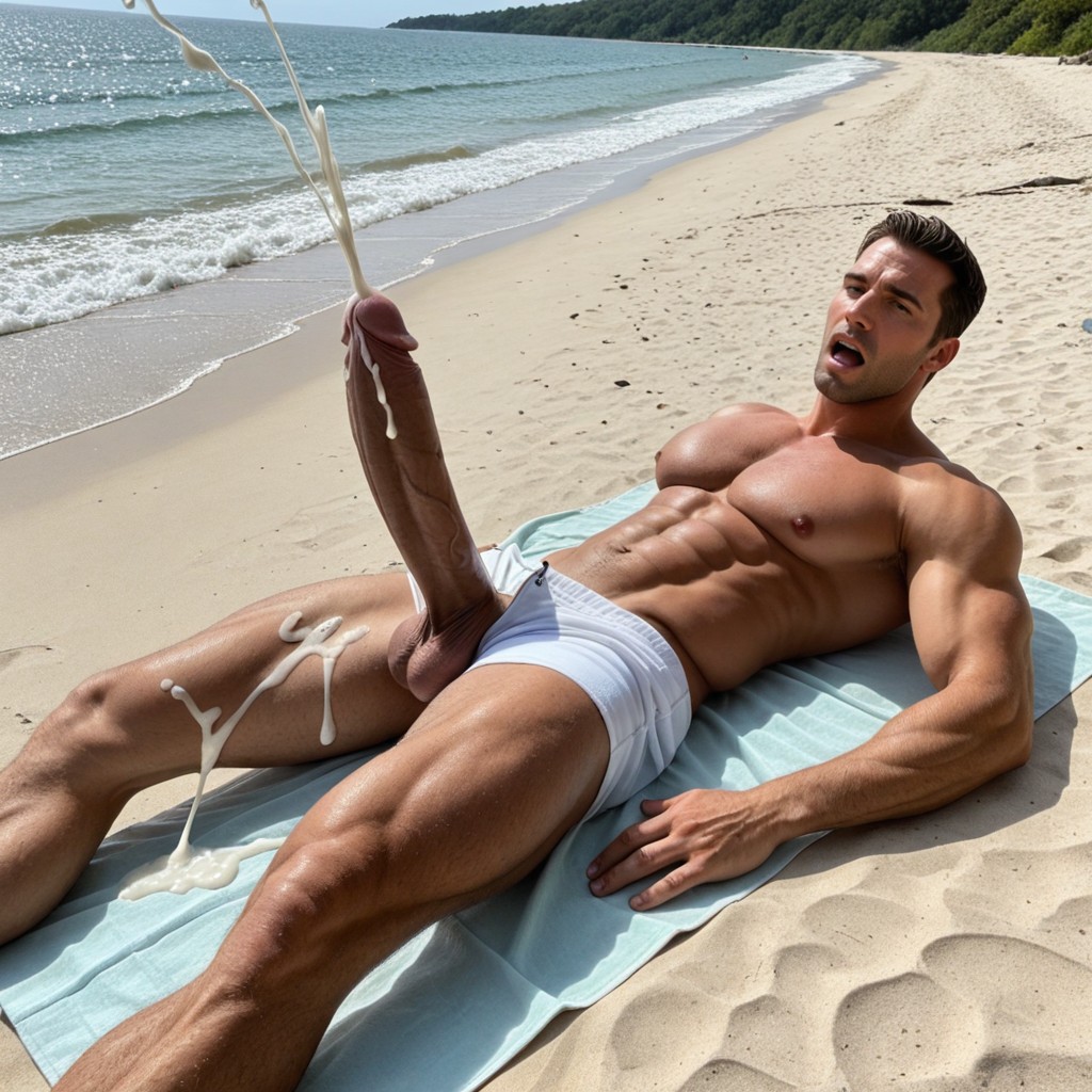 man, handsome man laying on the beach, on the beach by the sea, mans eyes half closed, lying on the bath towel, solo man, only man, whole body, perfect cocks, porn cocks, gigantic cocks, perfect cocks, gigantic white cocks, monster veiny flaccid cocks, impossibly thick cock, full body view, hyper cock, gigantic cock, extremely gigantic cock, extremely thick penis, enormous cock, hyper cock thicker and longer than entire body, veins on cock, (extreme hyper cock: 1.3), cock bigger than leg, thick white semen ejaculated from the top of the penis, thick white cum ejaculated from the top of the penis, massive cumshot, hands free, (massive cumshot:1.2), orgasm face, hands resting on beach, both hands pressing on the beach, hands off, the penis points forward, bare feet, the whole body is in the frame, the lens is pulled away, women are surprised, gigantic breast