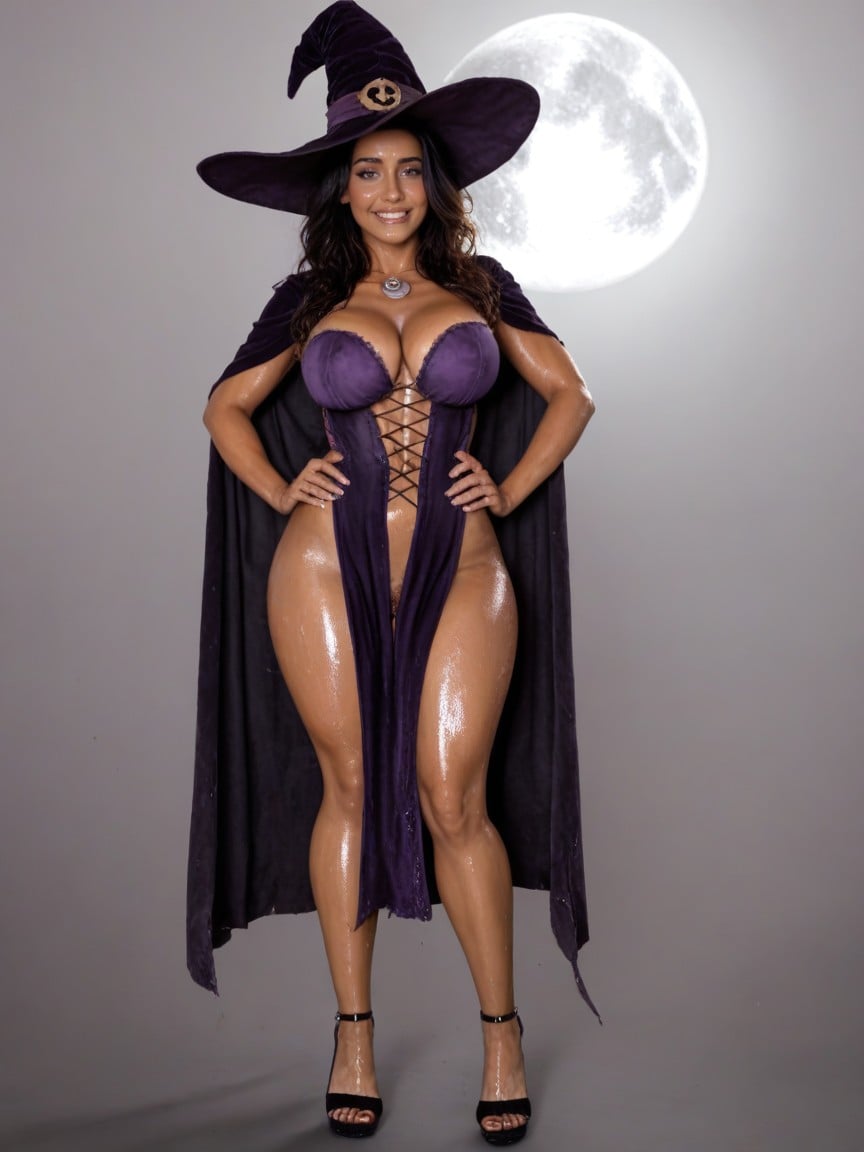 Nidalee standing with her hands on her hips wearing purple witch costume