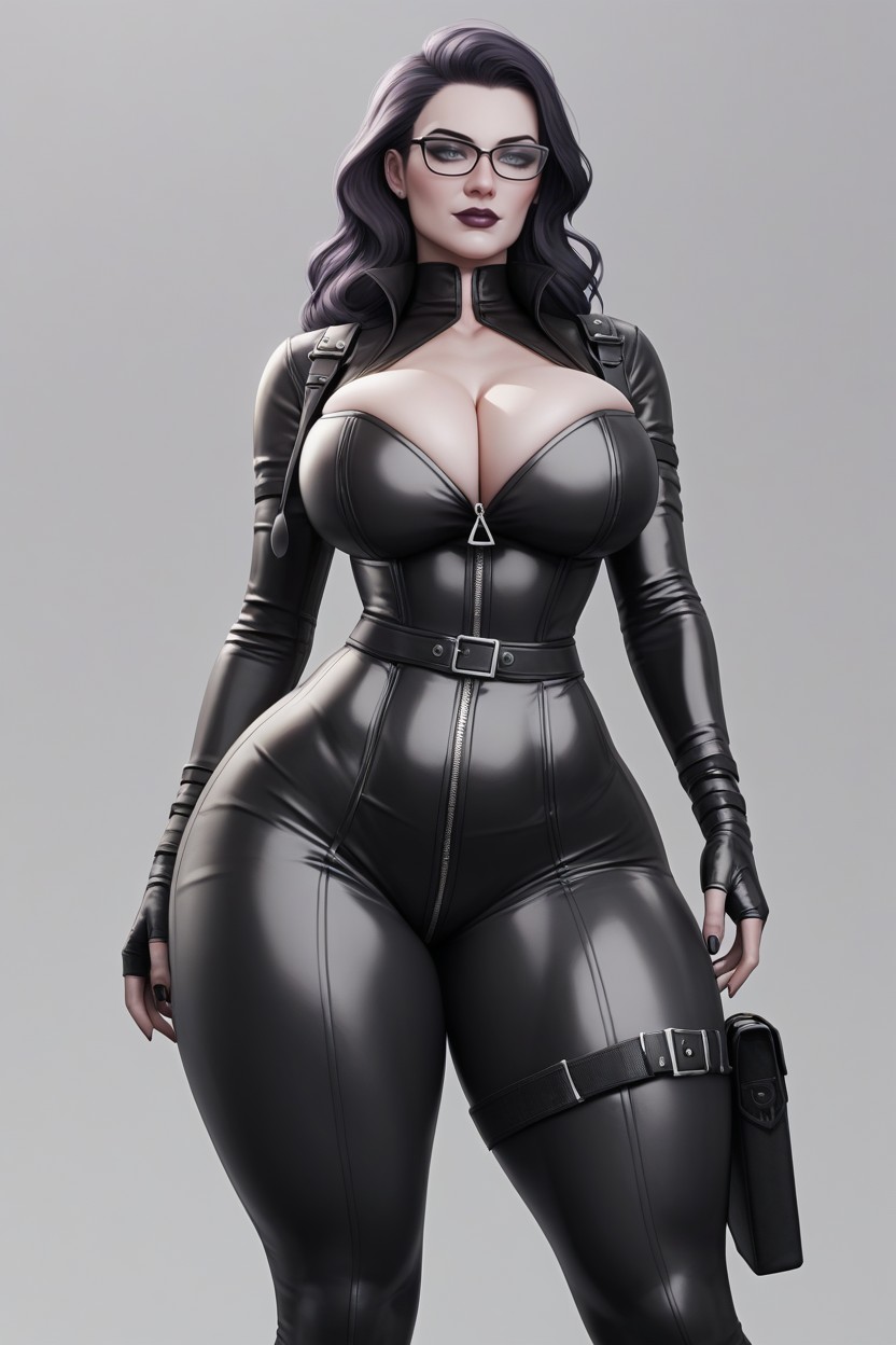 baroness from gi joe, glasses, black latex tight special forces clothing, long tight sleeves, lots of details on clothes, fingerless gloves, long zipper, black straps belts with ammo, shoulder straps, holster, straps on the arms, straps on the legs, hyper toned waist, hyper large massive hips, simple gray background