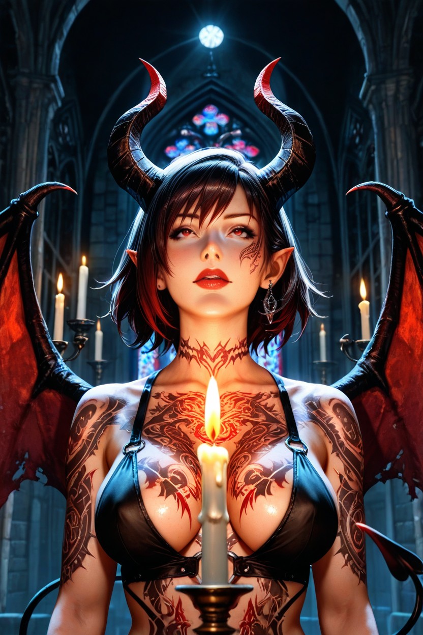 Iris amicitia from final fantasy, succubus, beautiful face, sexy, goth, gothic, tribal tattoos covering her whole body, complete body tattoo, big demon wings, big demon horns, demon tail, defined body, dark night, black sky, church vitral, naked, fully naked, nude, completely naked, close up, candles, volumetric light, twilight, counter light, ultra detailed, hyper realistic textures, medieval dark fantasy