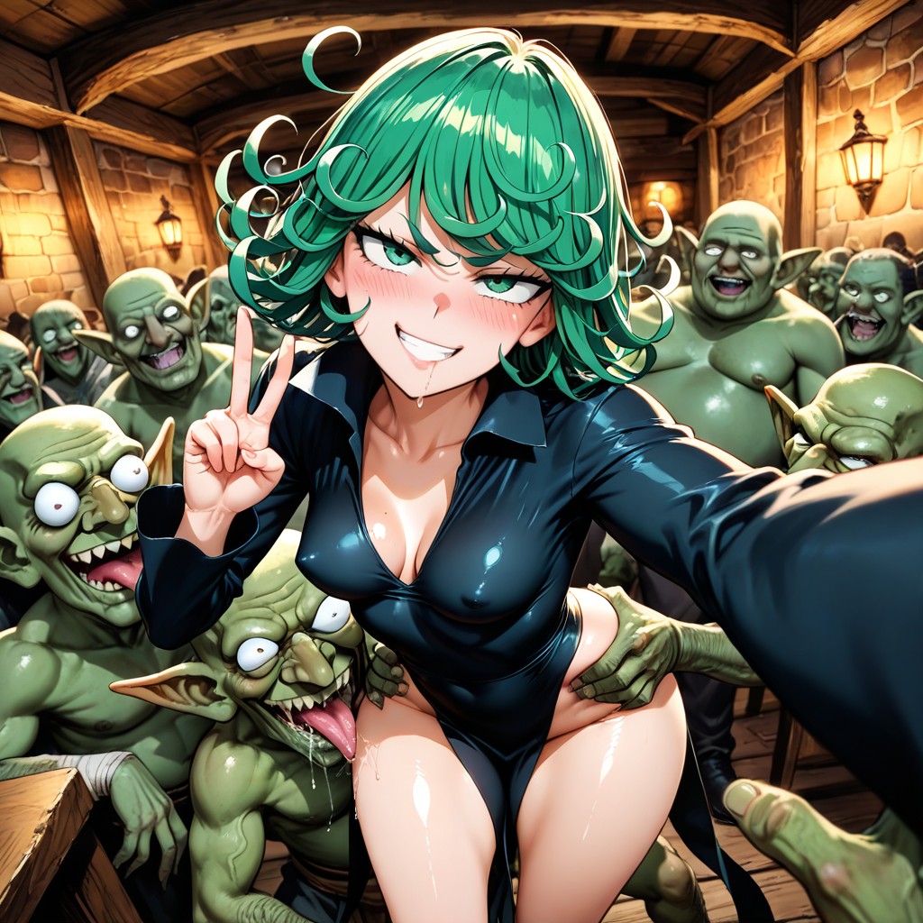 tatsumaki, supermodel, perfect figure, beautiful body, body, perky breasts, oiled skin, in universe, hyper flexible, fit body, shy, perfect face, body, waist, dark makeup, scrawny, (extremely bulging eyes: 1.3), clothes from tatsumaki, peace fingers pose, hyper snatched waist, anime style, bulging eyes, tavern, super horny, blushed face, eyes protrude from their sockets, pawg ass, standing, (ugly goblin monster: 1.3), waist grab, tits grab, ass grab, kissing, saliva, gangbang, crowd, superdrunk, man pov, superdrunk, pushup