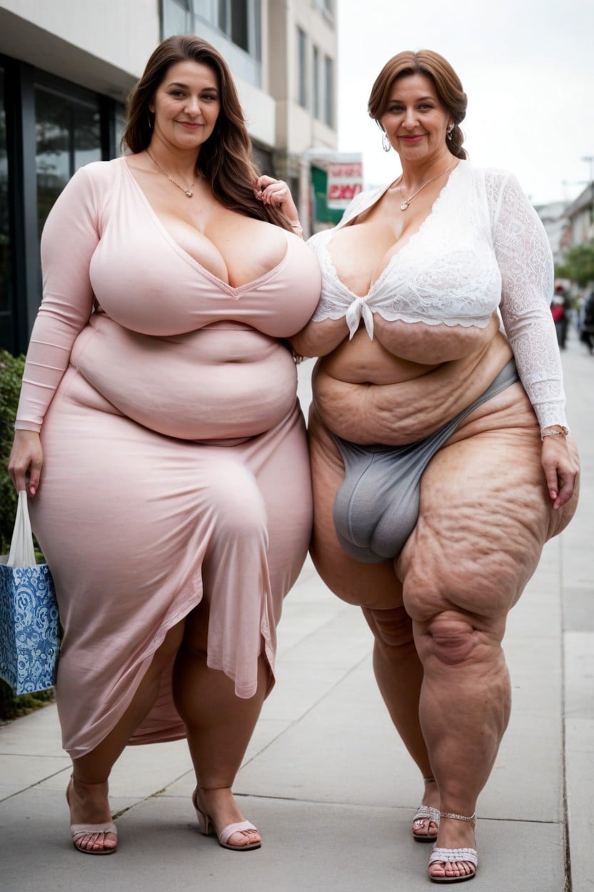 futanari, gigantic breasts, beautiful, wrinkles, mature, gorgeous, standing, holding shopping bags, walking in busy parking lot, standing next to bigger grandma, grandma is bigger, long brown hair, hips so wide seeing hips from the front cellulite body plump lips hair down to shoulders, fully clothed, hyper thick bulge girthy penis bulge plump lipsgigantic bulge under clothing detailed cock outline gigantic saggy breasts under clothing gigantic ass, gigantic penis, gigantic balls, long pink sweater dress, form fitting clothes, fupa, bulge, milf, thick thighs, big belly, dress, long dress, bulge under clothing, fat, obese, chubby, big belly, obese belly, impossibly large ass, detailed parking lot outside building, extremely fat obese body, cellulite skin, cellulite saggy body, hyper obesity, obese flabby fat, hyper thick thighs, fat thighs, fat cellulite legs, cellulite arms, fat saggy arms