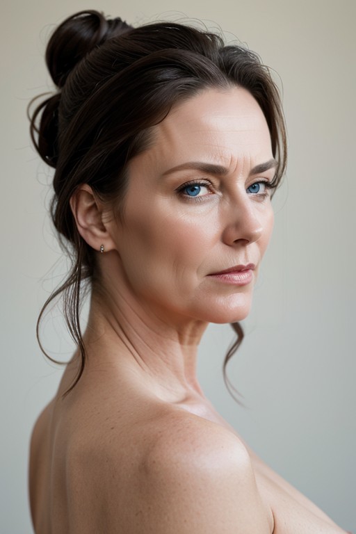 view from side, side view, close up face portrait, view from side, side view, close up face portrait, of years old British headmistress dominatrix, mature face, Victorian Edwardian shiny black hair, hair bun, blue eyes, superior attitude, dominant attitude, dominant face, looking at the viewer, nude, naked, completely naked, side view