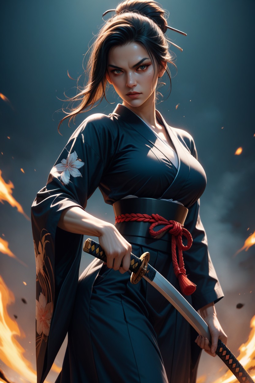 holding a katana with both hands in a dynamic fighting stance,
