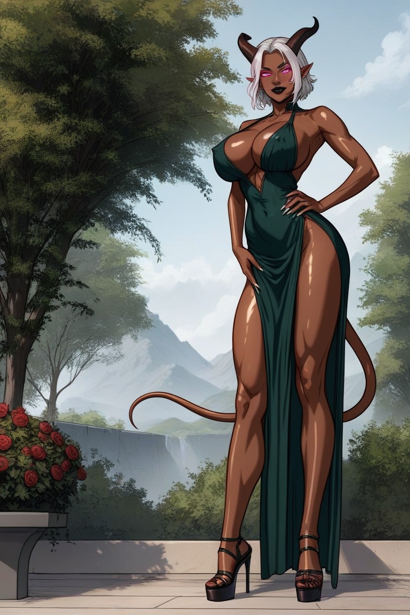 fantasy tiefling, tiefling woman with dark grey skin and pixie white hair, dark horns, dark skin, deep black skin, grey skin, gray skin, long tail, white hair, hair, style, messy hair, hair swept back, slicked, magenta eyes, glowing eyes, devil eyes, stiletto platform shoes, halter top dress, dark green dress, cleavage, hard nipples, erect nipples, big ass, large breasts, rounded breasts, waist, wide hips, lean build, athletic, long legs, oiled skin, long black fingernails, full body view, full body, front side view, low angle, three quarters view, facing viewer, looking at viewer, standing, legs spread, flashing pussy, wet pussy, lifting skirt, blushing, horny, standing seductively, grabbing boobs, garden, outdoors, evening, deep black lipstick, gigantic bimbo lips, highly detailed, very detailed