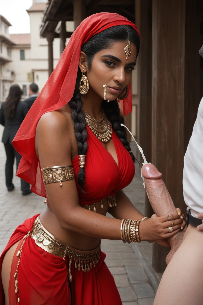 Fully clothed very Dark coal skinned hindu rajasthani tribal indian woman in a red chiffon embellished ethnic indian rajasthani skirt and red veil, wearing lots of golden indian jewellery, bindi on forehead, henna tattoos on forearms and hands, long hair with gold ring bands, adorned with gold rings, giving a femdom aggressive handjob to a caucasian man, she is gripping his cock tightly with both hands, furiously pulling his cock, punishing him, huge cumshot, aggressive handjob, huge white cock only, huge white hyper cock, hindu indian wearing full ethnic indian rajasthani skirt and veil, traditional jewellery, rough handjob in her rajasthani costume, village