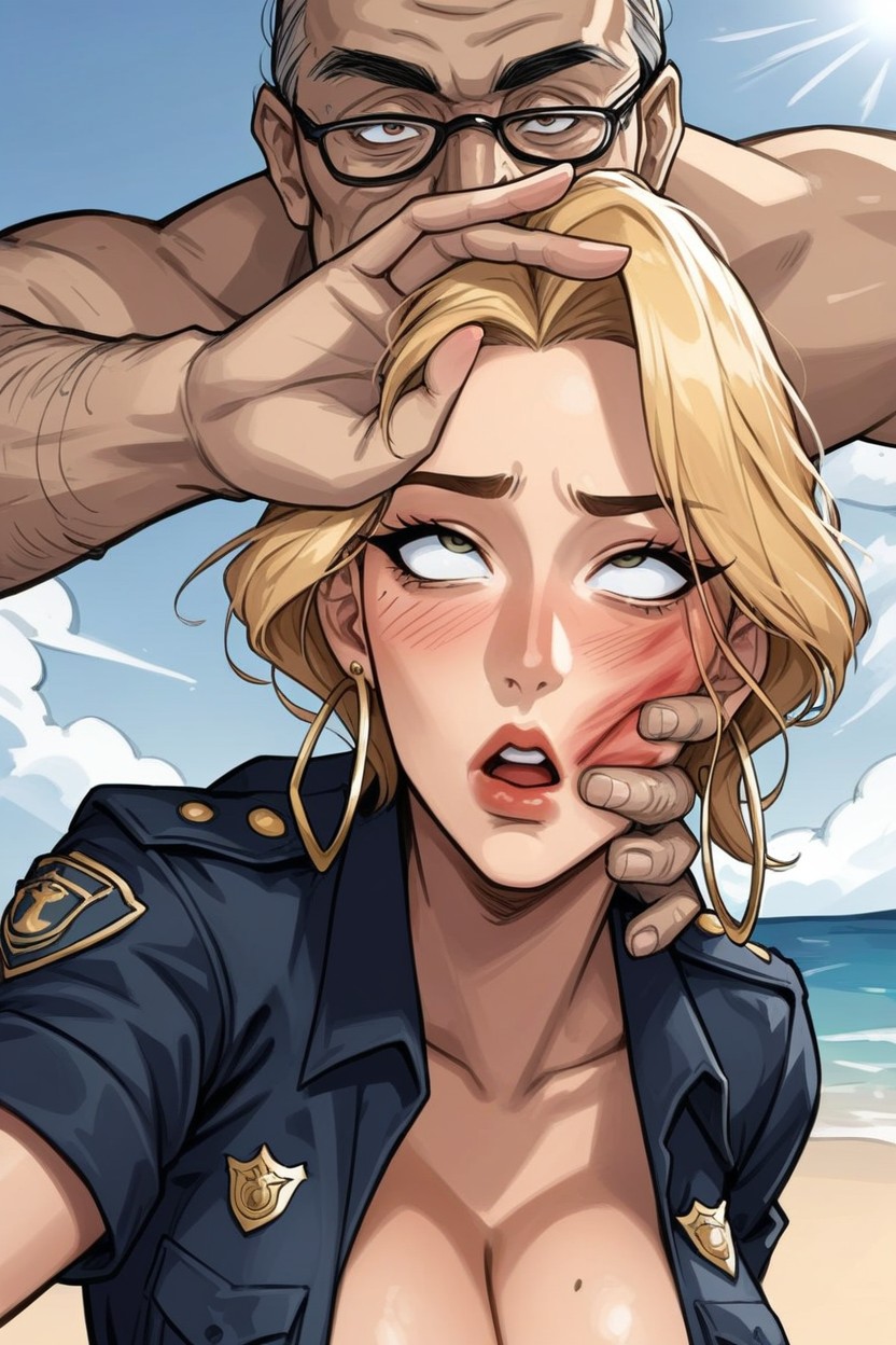 ugly old man in police uniform, old mans hand hitting her face, woman slapped by old man, red marks on boobs, motion lines, spank marks, hand print on face, tanned, piercings, blonde hair, rolling, maledom, old man slapping her face hard, slap motion line, her, her hands cuffed, on tits and face, rolling down her face, woman smacked across her face using by old man, woman slapped hard by old man in police uniform, on face, slap impact, rolling down her face, hoop earrings