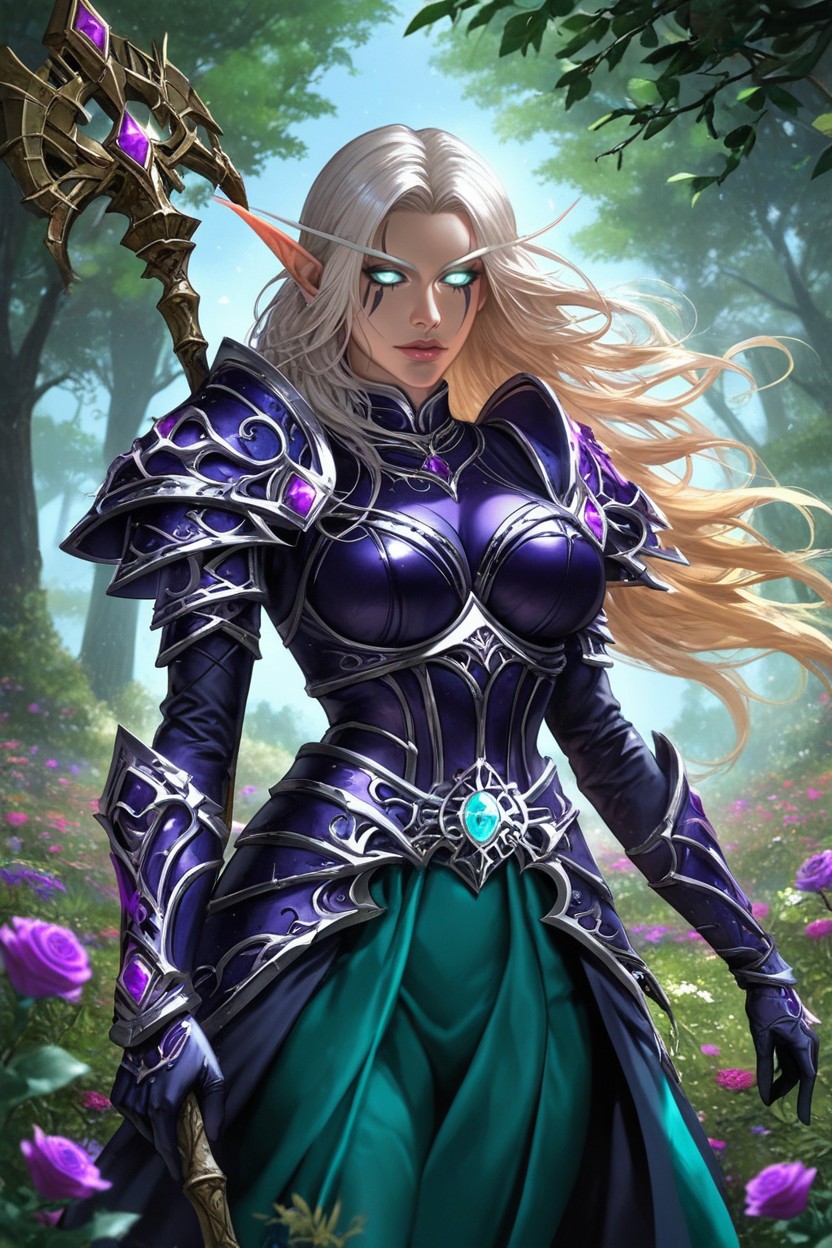 high elf female from world of warcraft with magical forest staff, staff with leaves and flowers, elf green staff with ivy and leaves and flowers, long ears, flaming turquoise eyes, turquoise colored eyes, bleach blonde, pale blonde, platinum blonde hair, long hair, world of warcraft outfit, turquoise outfit, dark violet armor, dark violet corset, correct number of limbs, anatomically correct, forest, flower field, purple roses field, focus on eyes, detailed eyes, dark violet lightweight fabric armor with a leather breastplate and corset