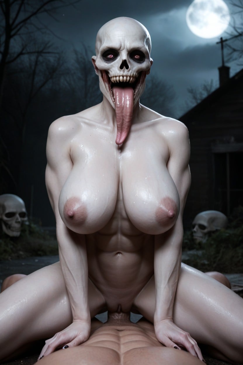 tall grey alien women, evil smile, extremely sharp teeth, bald, psycho face, thick muscle thighs, huge round breasts, breast expansion, wet body, eyeless, pale skin, abs, storm, night, low light, abandoned, dark ambient horror atmosphere, spooky, horror, long tongue, man with a massive veiny dick, cowgirl vaginal sex, photorealistic, skulls thrown on the floor, head skulls everywhere, skulls all over the place, woman does not have skull face