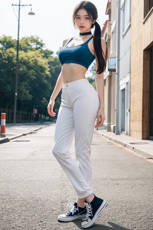 cutie, (cutest face:1.3), lucky star artstyle, one woman, standing, (cutie:1.3), beautiful face, perfect face, blushing, embarrassed, looking at viewer, black hair, low twintails, woman has soft pale skin, pale white skin, freckles, big round eyes, choker, highly detailed, award winning picture, excessive detail, hd, soft light, soft colors image, blue eyes, tight clothes, underboob crop top, red crop top, oiled up, fat round ass(sound effects:1.1), motion lines, wide angle, one breast exposed, hdr, award winning photo, woman wearing converse shoes, woman 1, 5 meters tall.