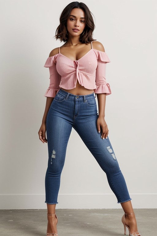 dora from dora the explorer, a supermodel stands in full body contrapposto, hips tilted, knees balanced, spine straight, shoulders aligned, arms resting at sides, feet planted firmly footwear is bubblegum pink patent leather stilettos, heels sharp, soles structured, reflective grain visible, pink gloss anchoring into the ground shadow, casting saturated pink gleam across floor and ankles denim jeans are ripped and, frayed threads curling at knees and thighs, faded texture anchoring dark tone above, a cropped canary yellow cotton shirt clings tight, ribbed weave etched with fine folds, fabric stretched across chest, saturated yellow radiating spill light onto torso, ribs, and arms, reinforcing its chromatic dominance hair is black and straight, controlled volume, gloss reflecting rim light subsurface scattering, fabric threading, skin pore clarity, volumetric haze, photometric depth, and rim lighting interlock realism across her entire head to toe figure