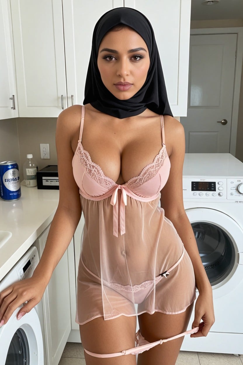a mans standing pov, his arms and penis are within the fov, his right hand holding his own erect cock, he is standing in a cramped laundry room, washing machine, also a woman in his fov, viewer is close to the woman, can see down her chest, woman is close to viewer, pressed against milf, cock pressing against her thigh, matronly and sexy, milf hijab, standing, black hijab, wearing a nightgown, black nightgown, low, transparent nightie, medium long nightgown, mans left hand is pulling her nightgown, pulling down top from hem of nightgown, top of breasts and top of bra exposed, pink bra, cleavage spilling out of bra, black thong pulled down, thong has been pulled down and bunched around her thighs, sultry, eyes wide with surprise and amusement, dynamic action, annoyed, playing hard to get