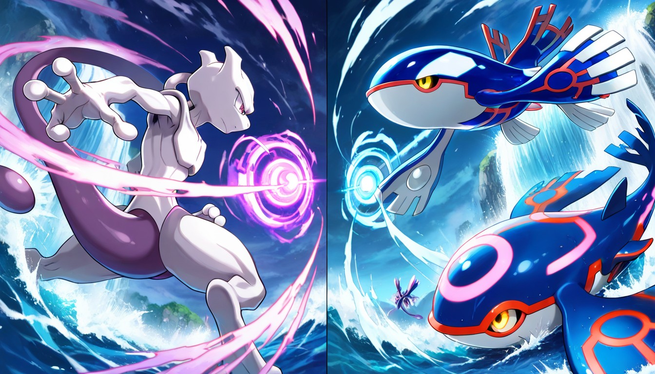 Mewtwo And Kyogre Battling In Various Positions With Various Moves, Kyogre Uses Waterfall And Hydro Pump Against Mewtwo, Mewtwo Uses Psychic Against Kyogre AIポルノ