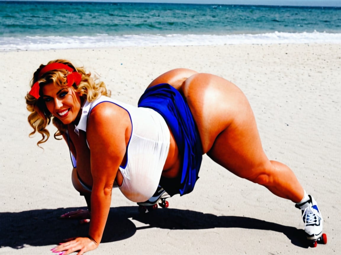 fucking a hairy cock near the beach, looking at viewer, no makeup, super beautiful idol, happy, blonde wavy hair, eighties hollywood, blue eyes, hairband, light fair skin, soft pale white skin, no panties, no bra, massive natural breasts, very saggy natural breasts, huge natural breasts, puffy nipples, light pink nipples, giant natural sagging breasts, big natural sagging tits, hanging breasts, sagging tits, massive sagging breasts, big natural sagging breasts, wide hips, phat ass, bubble butt, breasts exposed out of shirt, eighties fashion, having sex with hairy cock, pinup model sexy pose, hyper realistic, boob out, hairy pussy exposed under skirt, roller skates, beach boardwalk