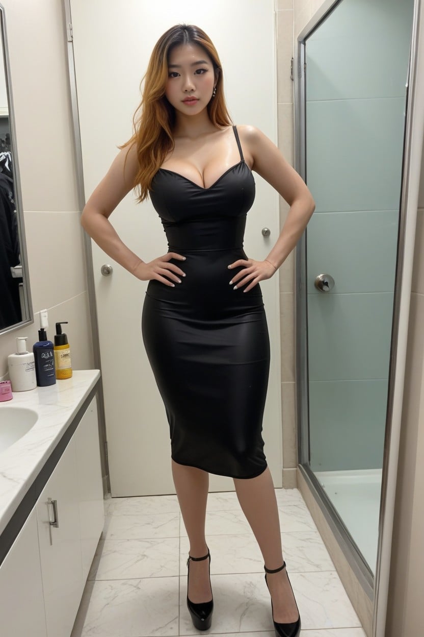 honey hair, korean, tight black skims sundress, black dress, bathroom, bathroom mirror, night, hands on hips, taking picture, taking picture with phone, big round eyes, asian baddie, asian baddie style, asian baddie aesthetic, abg, abg asthetic, sexy lips, full body, wasp waist, lean waist, tight waist, rounded hips, wide wide hips, extra wide hips, busty hips, busty round hips, perfect hips, sexy hourglass shape, lean body, pear shape body