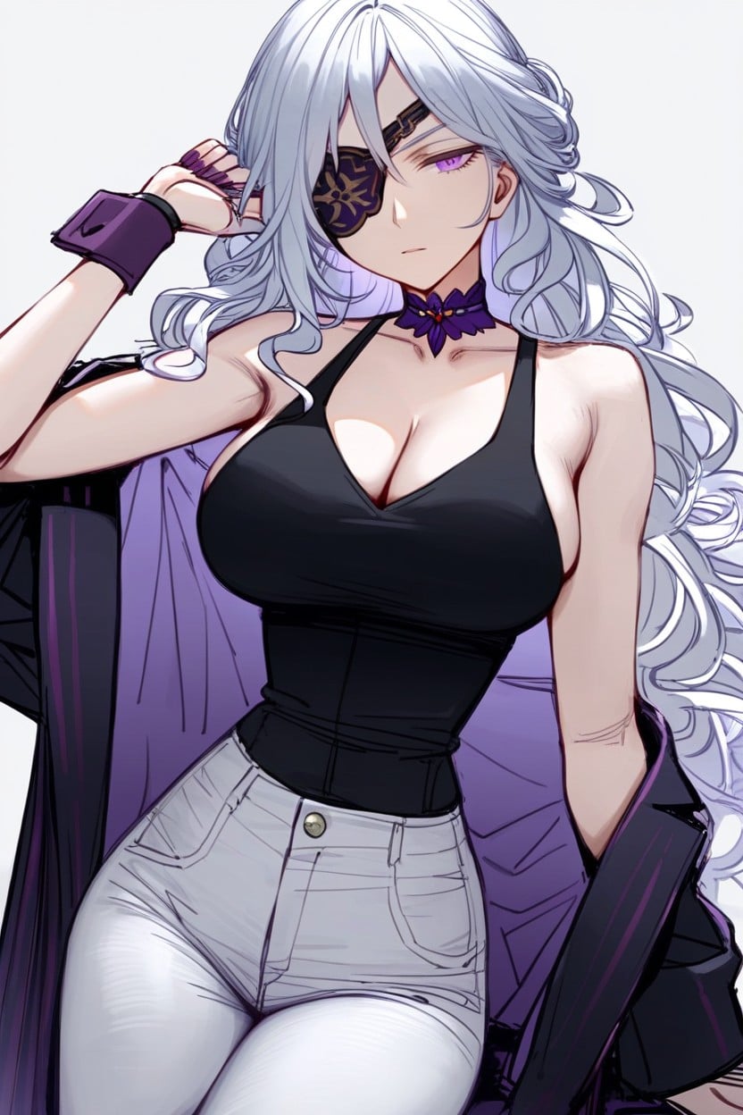 ultra detailed, accurate anatomy, sketch, blank background, beautiful appearance, gorgeous woman, metal ornamented eyepatch on her eye, purple choker, quite formal and extravagant outfit, (dark purple tanktop: 1.1), ornamented white coat decoration, (white jeans: 1.3), dark blue tanktop, white jeans, ornamented coat, dark purple fingernails, strict and bored expression, wide dark purple tanktop with long cleavage, decorated coat, gray and white hair, faded forelocks, purple eye, elegant ornament coat, waist, white pants, ornamented cuffs, decorated cuffs, beautiful purple eye, sexy woman, hot, curly hair, spiced hair, flexible, pose