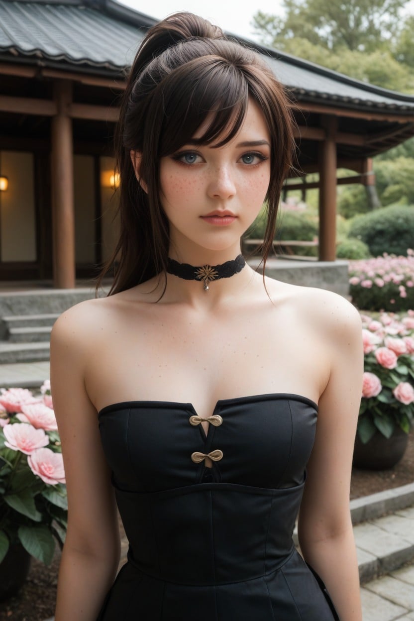 toon, light fair skin, lean lean body, on her back, light fair skin, unnatural wasp waist, soft pale white skin, lean body, sucked in stomach, soft pale skin, freckles, face of klee genshin, shy, nervous, black hair, ponytail, sideswept bangs, eye shadow, blue eyes, freckles, wasp waist, long hourglass figure, lean lean body, choker, wasp waist, snatched waist, arm warmers, standing, black cocktail dress, shiny black cocktail dress, shy, nervous, cozy brown couch, gazebo, dark romantic garden, dark, night