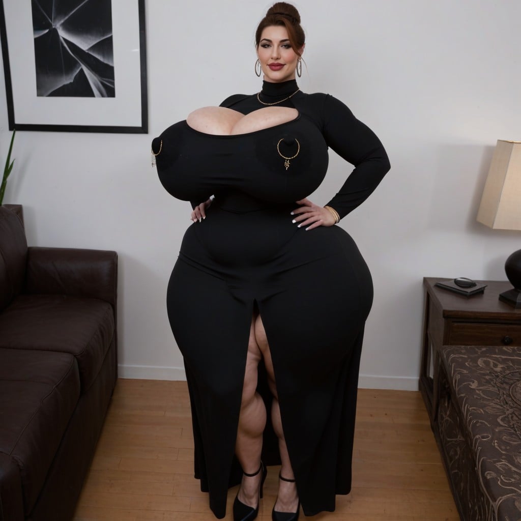 legs, hyper long huge black dress, turtleneck dress, long skirt, long sleeves, super wide hips, hyper wide hips, extreme hips, bubble butt, extremely waist, thick ass, looking at viewer, strong calves, massive ass, round hips, round breasts, round ass, round thighs, thick thighs, perfect figure, waist, big lips, puffy lips, full lips, front view, jewelry, earrings, bangles, cameltoe, white nails, love hearts, blushing, steam, mouth agape, hyper puffy cameltoe, massive caneltoe, cameltoe, enormous cameltoe, beautiful face, huge eyes, erect nipples, long curly hair, high heels, saggy cellulite