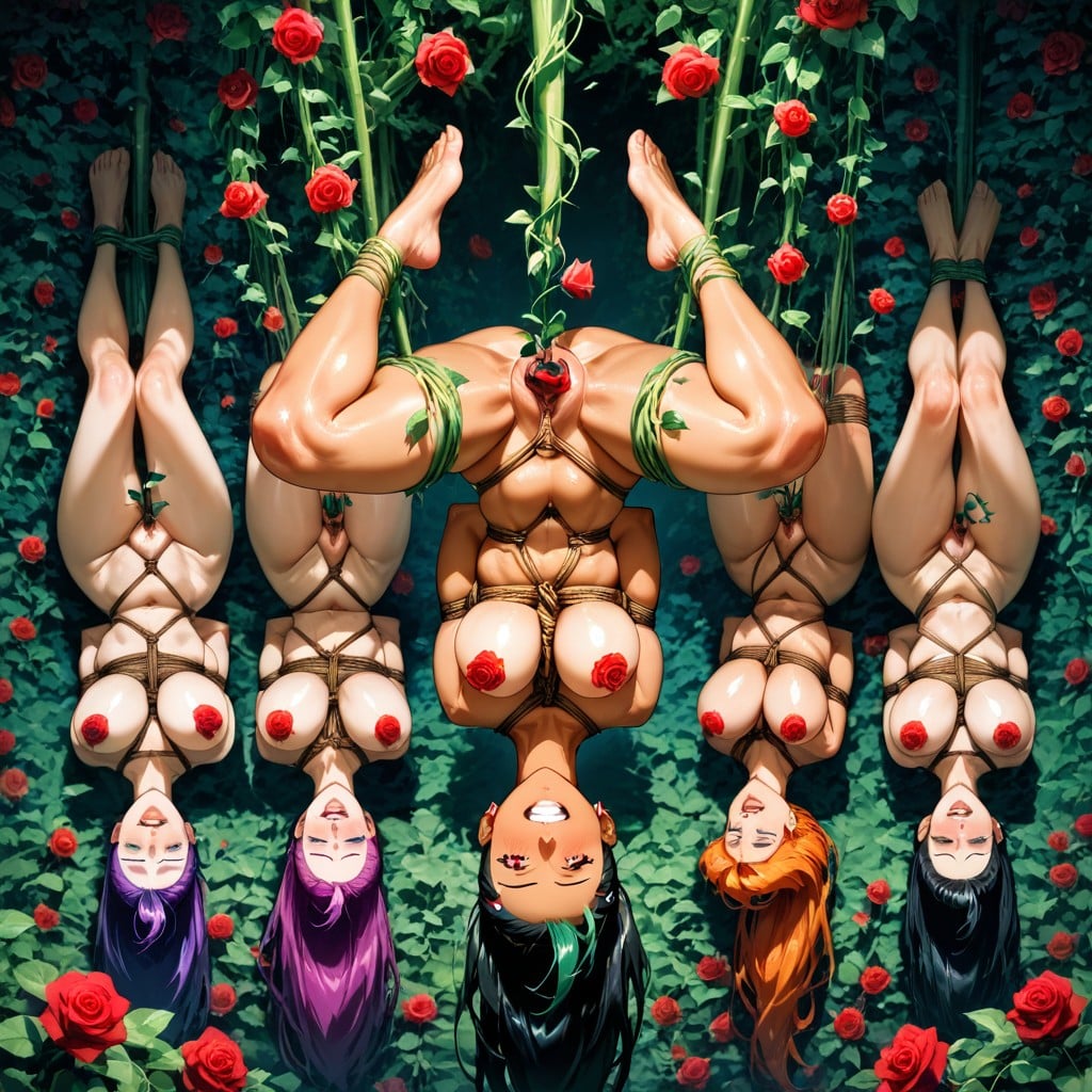 Orgy, long shot, flower garden, pokemon, jessie, misty, nemona, marnie and professor sada, (hanging suspended upside down in air by vines: 1.3), open crotch tangled in thorned vines, vine shibari, masterul sensual placement of women like pottery, masterfully detailed backgrounds, artistic composition, (flower stem vaginal insertion, flower speoutingoutfrompussyhole: 1.3), (rose blooming on clits: 1.3), rose blooming on nipples, rose on belly button, (flowerstemassinsertionflowersproutingfromasshole: 1.3), close set sagging half full perky breasts: 1.3), puffy nipples, (slimbody: 1.3), thick puffy labia majora, thick puffy labia