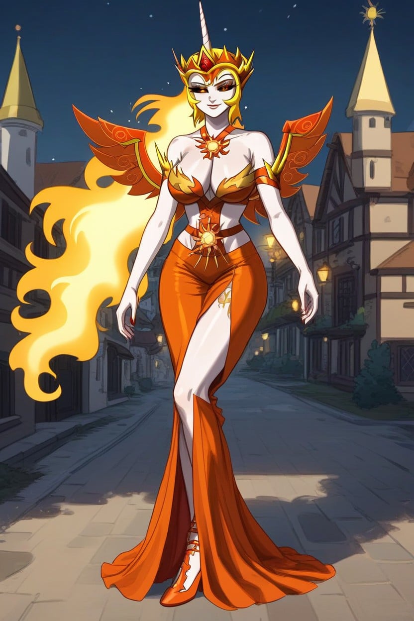 high resolution, solo, equestria daybreaker celestia, daybreaker celestia equestria, equestria daybreaker, daybreaker equestria, fully dressed in sexy clothes, wearing sexy clothes, fully dressed in very sexy clothes, wearing very sexy clothes, full body close up view, close up full body view, close up view of full body, magic mlp village, mlp village, equestria village
