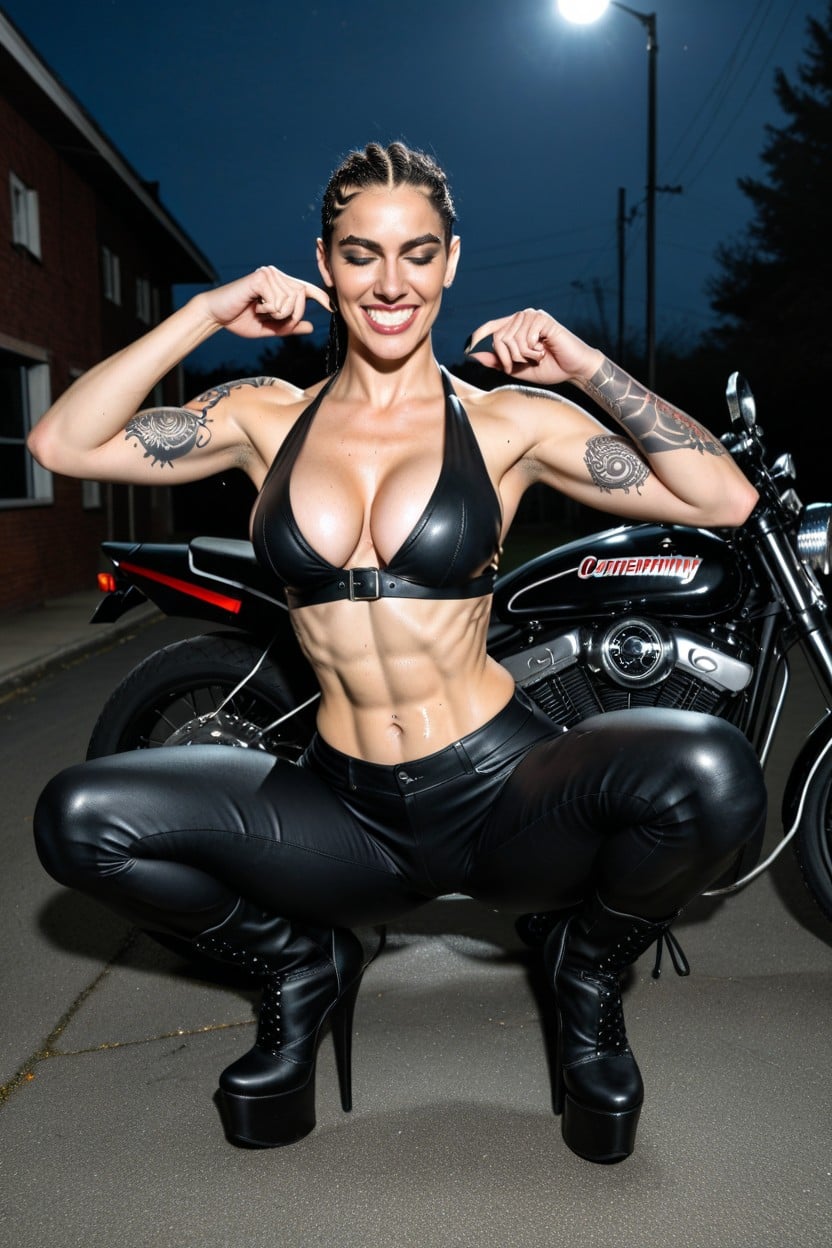 waist, (cornrows hairstyle: 1.3), soft delicate features, freckles, (visible ribs: 1.3), body, tattoos, multiple heavily tattooed, youthfull, ultra bright smile teeth, look at camera intensively, black nails, gothic platform boots, visible ribs and hips bones, thong strings sticking out of tight low rise leather pant, leather biker pant, visible thong higher than leather biker pant, black lips, big teeth, (thong sticking out of biker leather pant: 1.3), visible thong higher low rise leather biker pant, full body visible, parking lot at night, visible armpits, sweaty, (plunge deep push up cleavage: 1.3), tight push up cleavage, deep plunge cleavage, push up neckline which tightens and lifts the breasts, excessive push up, leanest body, sensual dance position, eyes open and look the viewer, (selene from underworld face: 1.3), look like selene from underworld, selene from underworld