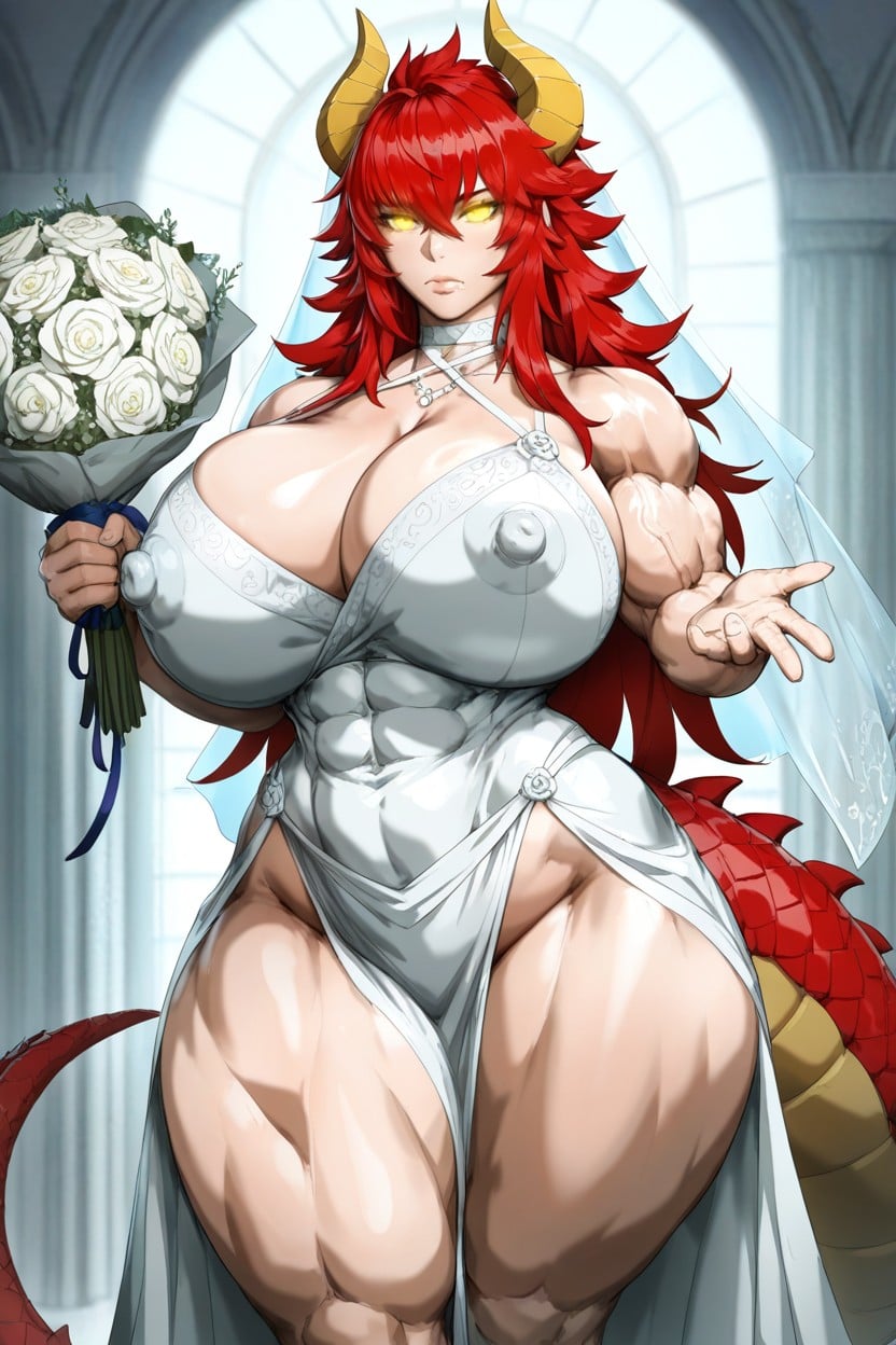 Zentreya, kunaboto style, bimbo, large bimbo lips, ultra high definition, standing, deep cleavage, abs, massive breasts, erect nipples, perfect waist, thick thighs, gigantic ass, perfect hands, looking at viewer, red dragon tail, red hair, yellow horns, expressionless, hypnotized eyes, holding bouquet