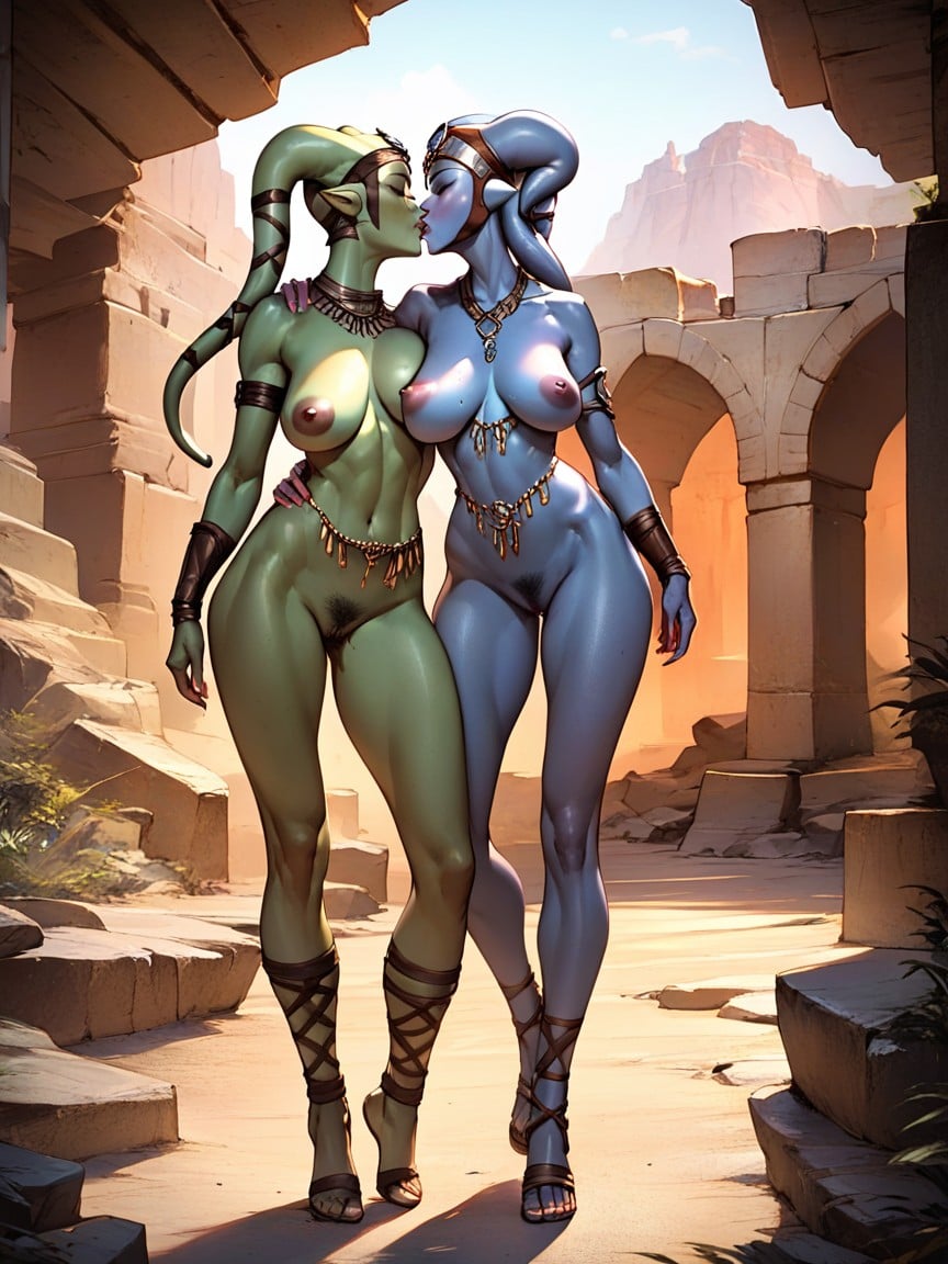 full body, 2girls, twi'lek1nude, green skin, perky breasts, breasts apart, puffy nipples, belly chain, waist, large hips, pubic hair, back dimples, gladiator sandals, twi’lek2nude, blue skin, perky breasts, breasts apart, puffy nipples, belly chain, pubic hair gladiator sandals, standing, kissing, in a stone canyon, desert