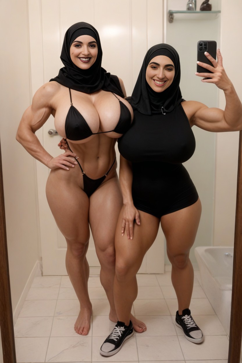 bathroom selfie hijab woman black lips biceps touching his cock satin gloves and taller than man man height woman giant woman tall woman muscular biceps