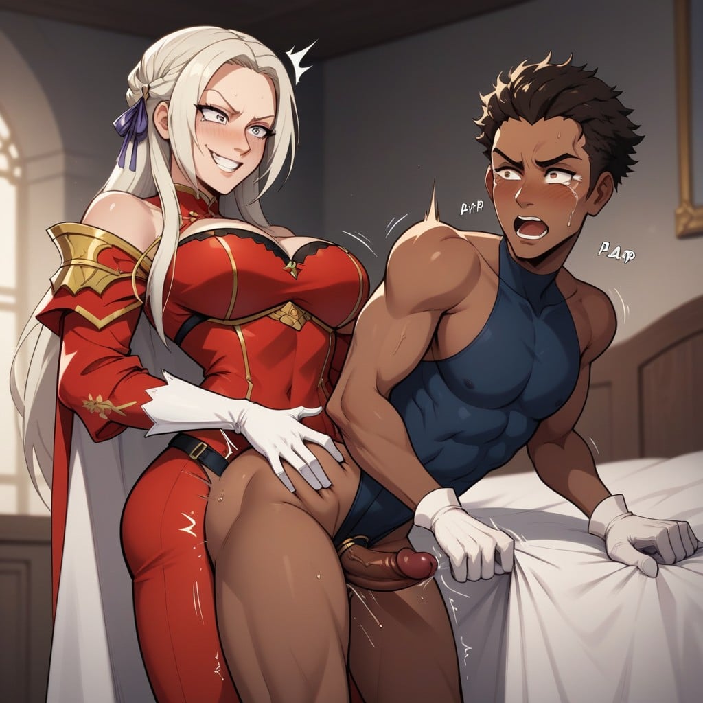 fire emblem, male and female, one african male, african male is submissive, male has hair, one female, edelgard von hresvelg from fire emblem, femdom, female domination, (tight white gloves:1.3), femdom, groping ass, ass grab, ass grabbing, (hands grabbing african males ass:1.3), edelgard von hresvelg with horny facial expression on her face, african male has shocked expression on his face, spanking, motion lines, moaning sound effects, clapping sound effects