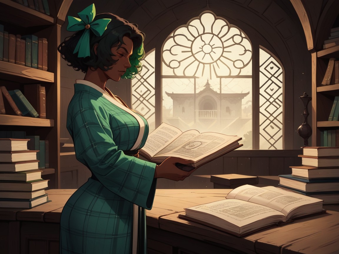 nsfw, fantasy setting, ancient library location, ancient books in background, candles in background, wooden shelves, dusty background, dust clouds in background, noir lighting, scholar, one woman, (dark ebony skin:1.2), black curly hair, energetic face, rectangle body type, squared shoulders, squared torso, chest and hips proportionate, squared chest width, squared breast width, breasts asymmetrical, squared abdomen, wide proportionate waist, low torso height, squared hips, hips proportionate to chest, squared ass, ass proportionate to hips, squared thighs, green hair ribbon, green monocle, (wearing green plaid clothes:1.1), ancient plaid toga robe, frog brooch, woman reading a tome, vibrant colors, saturated colors, high color contrast, high brightness effect