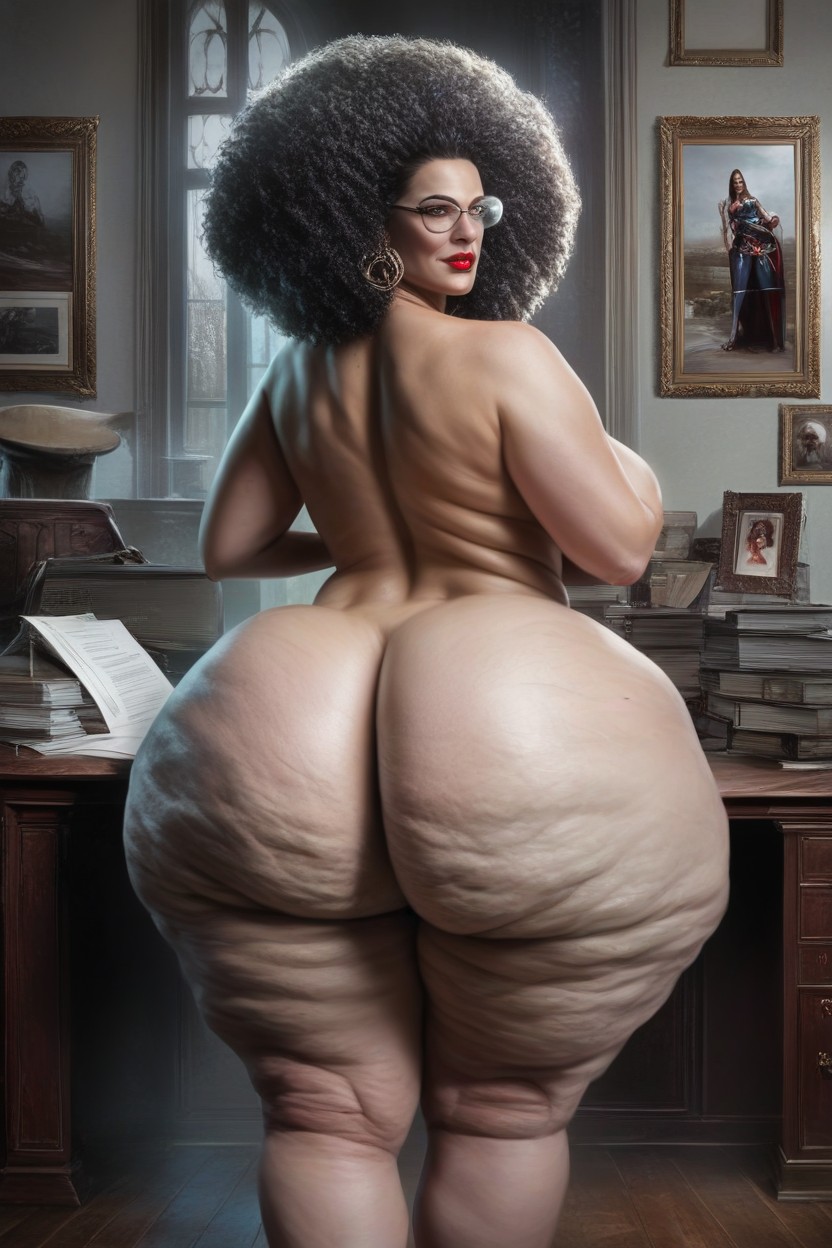 a tall oily skin, jewish lady, naked, with gray hair, gray hair, afro, afro, wearing glasses, red lipstick, shaped figure, cellulite, gigantic thighs, massive cellulite fake ass, fat ass, ssbbw massive fake booty, extremely enormous fake booty, extremely wide hips, ass triple width of shoulders, insanely huge booty, monster fake butt, booty cheeks extremely huge, gigantic fake booty like, extremely large ass, disproportionately large ass, thick ass, round ass, fat ass, extremely fat thighs, super thick thighs, hyper wide hips, extremely thick hips, fat hips, beauty face, extremely wide hips, thick thighs, extremely large ass, extremely big round ass, wonder woman walking away looking back at viewer in her office