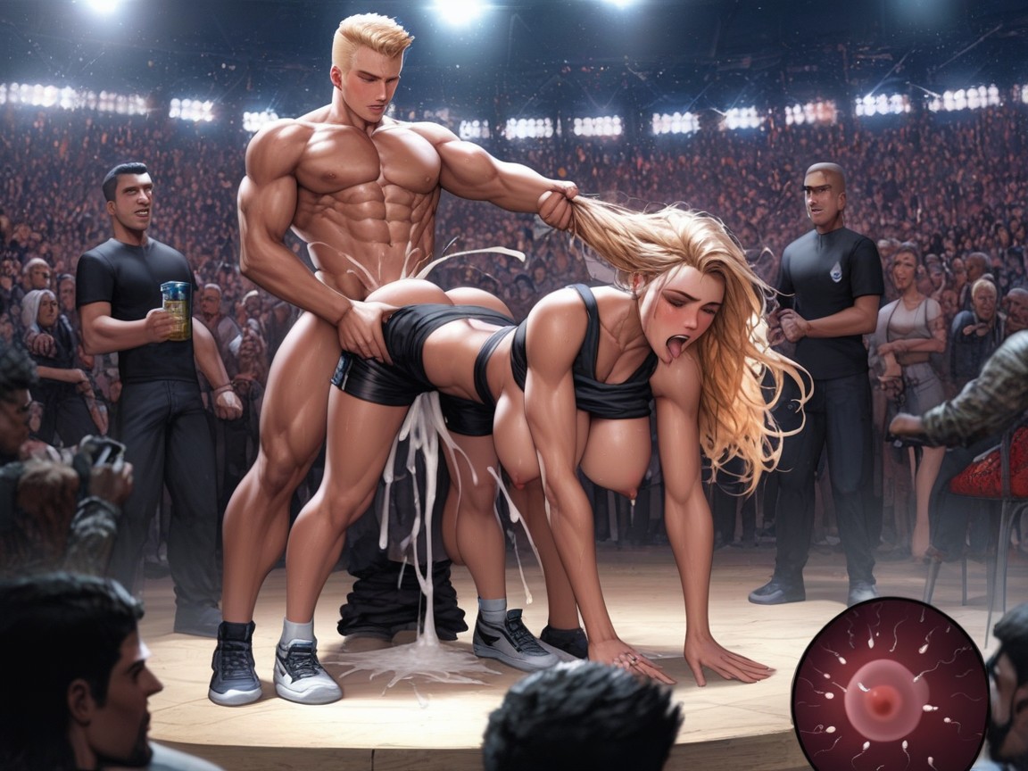 ufc ring woman, ufc ring, mms ring, ufc octacon, rough, hardcore, double penetration, huge penises, puufy nipples, exposed nipples, exposed ass, black tanktop, super black shorts, pulled down, excessive cum, extremely embarrassed, crowd watching, extremely bootyshorts, crowd cheering, struggling, squirming