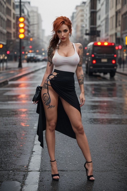 Full fitness body view, front view, amazing breasts, focus on defined legs, focus on legs, athletic fit body, elegant, sophisticated, long toned legs, full body tattooed, styled ponytail hair, orange and blue tomahawk hair, with bangs hair, messy tomahawk hair, orgasm face, pink full lips and blacked smoked eyes makeup, provocative tease eyes, sexy model position, jogging, runner woman on dress, outside night city, on a street, raining, face of pleasure having a huge orgasm, loose tshirt, white tshirt, knitted thighs long loose skirt, sensual toned legs, tattooed legs, black high heels, high stilettos, full hd definition, quality, full colors rendered, full body view, focus on toned legs, steampunk neo gothic style