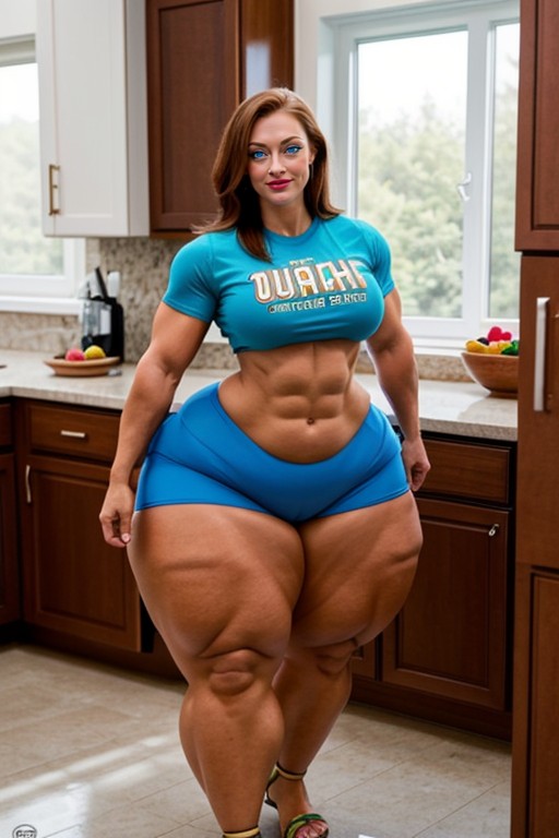 hyper gigantic massive muscles woman, (hyper gigantic muscles: 1.3), hyper massive breasts, tan skin, red hair, glossy pink lipstick, (bright blue eyes:1.3), highly detailed, (eight feet tall: 1.3), extremely long legs, hyper muscular, sexy seductive expression, massive muscles, hyper gigantic muscles, (growing:1.3), hyper gigantic muscle quads, (hyper massive muscle thights: 1.3), growth, hyper gigantic massive muscles, hyper huge massive muscles, massive muscles, hyper gigantic muscles, hyper huge muscles, hyper big muscles, hyper large muscles, hyper gigant muscles, hyper giant muscles, hyper gigant quads, massive muscular thights, hyper massive thights, pumped quads, hyper massive gigantic quads, pumped thights, flexed quads, thight shorts, (graphic tee:1.3), beautiful female face, posing flex quads, bulging thighs, gently smiling, wasp waist