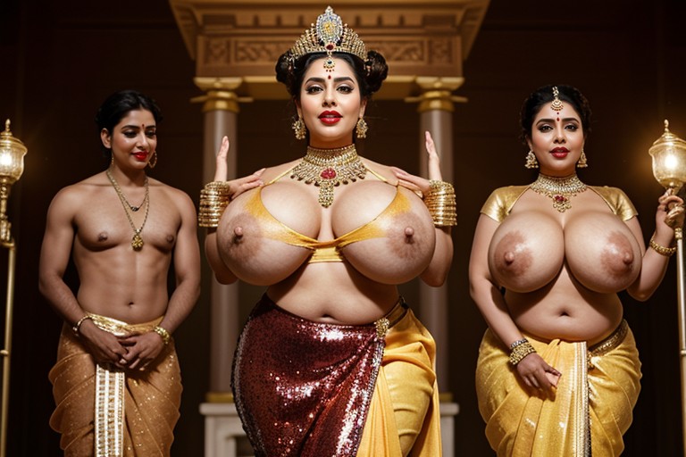Beautiful thick sexy woman, a curvy and plus size busty empre standing at her throne, ancient indian kingdom, large throne with guards, standing and posing seductively, ancient indian kingdom with queens servants, busty queen on throne in her ancient kingdom, guards and peasants standing around queen, black swollen nipples, extra long erect nipples, swollen black nipples, very huge and sweaty mammoth swollen breasts, black areolas and black nipples, ancient kingdom, throne with guards, jewelery, indian necklaces, bangles, earrings, secretary, tight red deep neck indian blouse, deep neck red sequin blouse, huge ass, huge hips, thick legs, yellow silky saree, sweaty body, yellow silky tight saree, black areolas and long nipples, see through satin yellow saree, golden heels, red lipstick, huge cleavage, super thick shiny thighs, legs spread wide, thong visible, sexy thick legs, full body picture, full body capture, heels, full height capture, wide angle shot, wide angle capture.