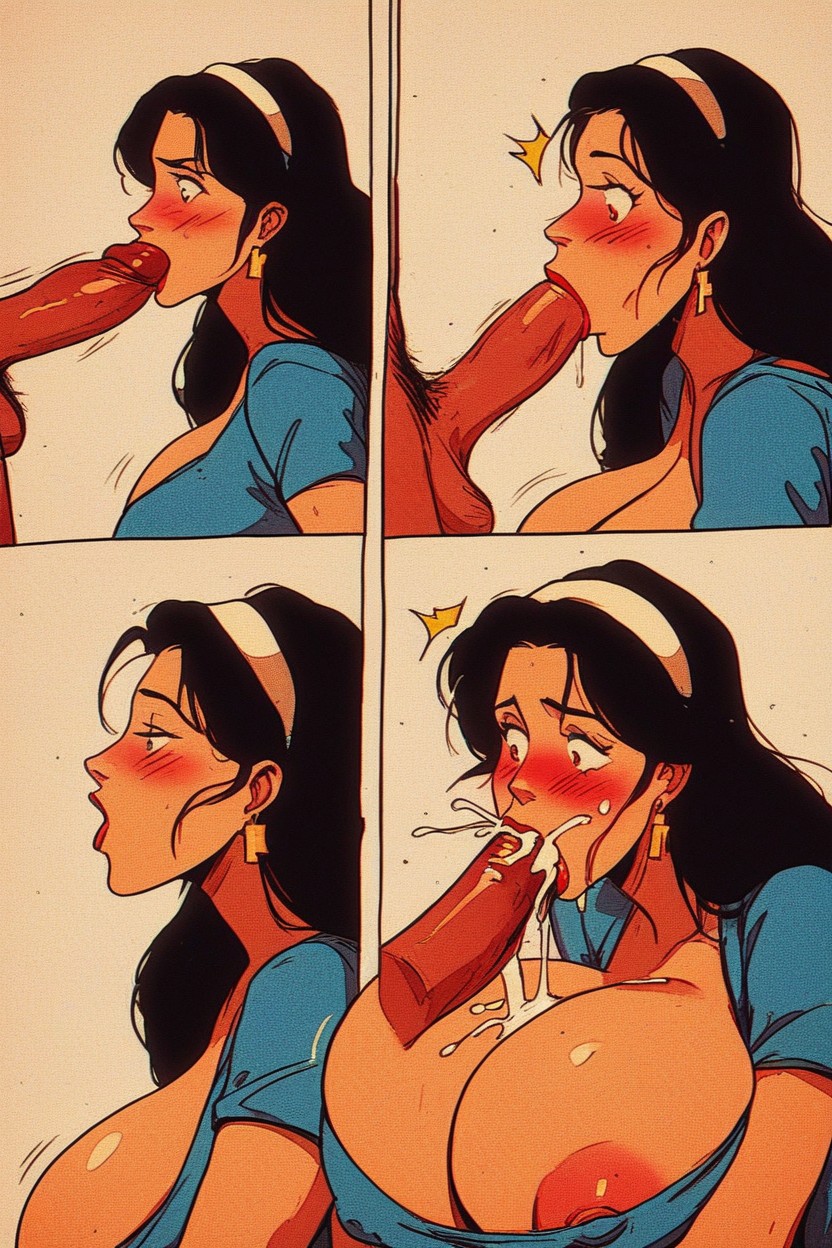 Man transforms into Jasmine from Disney. Gender transformation, breast expansion, ass expansion, surprised by her huge breasts, surprised by her big booty, erect nipples, becoming very aroused, seductive body, wall mounted dildo, bent over fucking dildo doggy style, comic panels, intimidated by huge cock