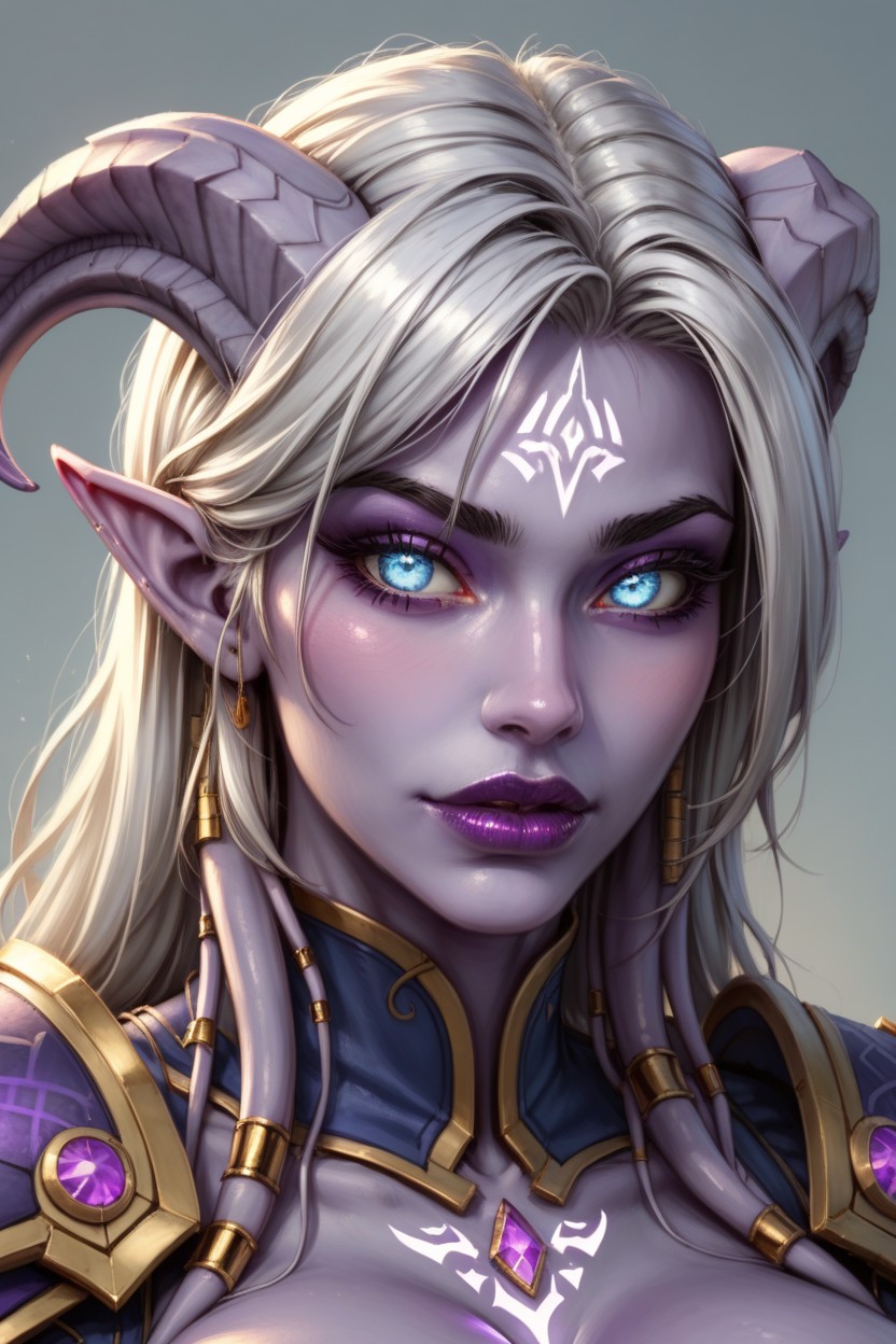 Purple draenei from word of warcraft, body, female draenei, gorgeous face, detailed face, detailed eyes, juicy lips, big full lips, silver hair color, purple skin, blue eyes, black makeup, purple lipstick, lean body, draenai tail, draenei hoof, UHD, (Disney Pixar animation style:0.7), hyper length, body full tattoo, uhd, perfect eyes, best detailed hair, hdr, looking at the viewer, entire body, full body view, wearing paladin armor, close view, purple skin