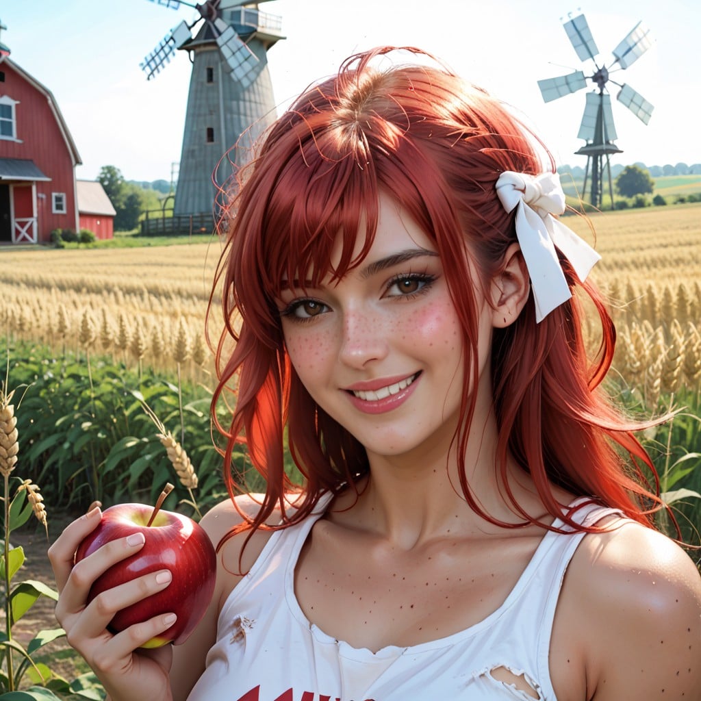 gardenia from pokemon, extreme close up on her face, portrait, beautiful woman, red hair, bangs, red hair ribbon, many freckles, big brown eyes, sweetest female in the world, horny expression, flirty, vibrant, bubbly, medium breasts, extremely oversized tank top, ripped tank top, eating an apple, on a, in front of a, near a field of wheat, windmill, sunny, hdr, blum effect, raytracing, highly detailed image, award winning image