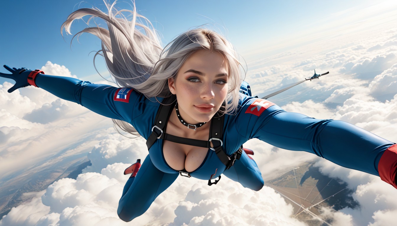 realistic texture skin, (exaggerated upper part fake giant boobs:1.2), close set spherical boobs, (exaggerated upper spherical cleavage:1.2), perfect fit, tight legs, perfect legs, (lean body:1.2), unnatural wasp waist, (lean waist:1.2), cutest diamond face type, (snub nose:1.2), sparse eyebrows, (nude russian bimbo:1.2), wide full lips, (fake boobs are always sticking straight up:1.3), harness, weightless thong, (round exaggerated hips:1.3), freckles, gloves, (huge upturned eyes:1.2), makeup, (straight hair:1.3), silver hair, (long and longest hair:1.3), choker, snide smirk, legs belts, ultra high definition, engaging with surroundings, (horizontal pose:1.2), photorealistic, horny pussy, diffused light, high heels, backlighting, warm colours, (high angle view:1.2), hair is blowing in the wind, (russian beauty:1.2), complexity, skydiving, parachute lines, in the clouds, flying with parachute, outside, acid rain, storm, highly detailed background, character from the game chopper