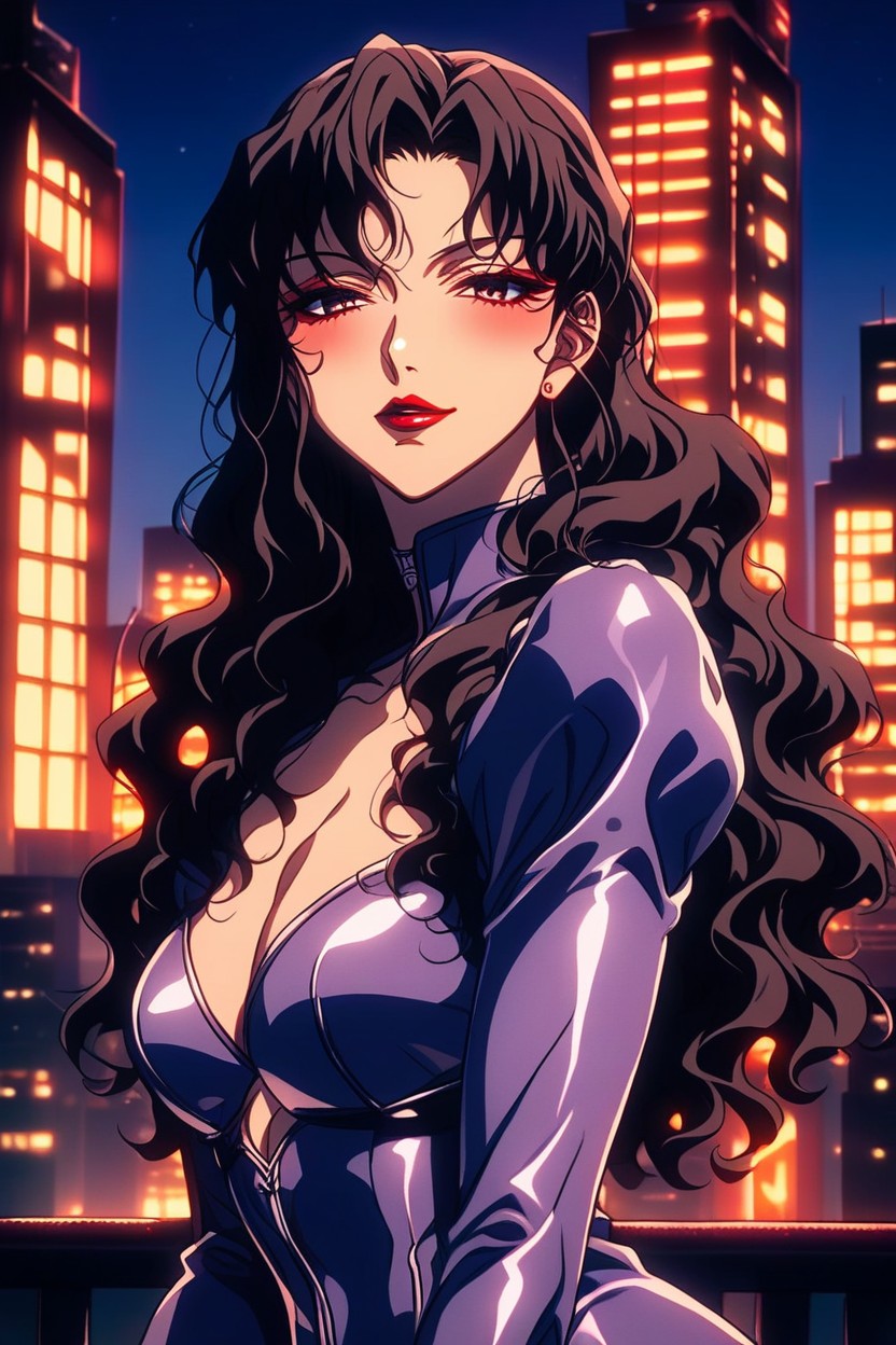 rui kisugi from cats eye, (skyscraper rooftop: 1.3), overlooking the town from the skyscraper rooftop, (open chested: 1.3), kisugi rui is looking at the smartphone in his right hand, (kisugi rui is looking at the smartphone in his right hand: 1.3), kisugi rui is looking at the smartphone in his right hand, (kisugi rui is looking at the smartphone in his right hand: 1.3), new moon night, night, huge breast, dark brown hair, extra long hair, wavy hair, red lips, purple latex suit, zoom in, beautiful face, blush, tongue out, side view