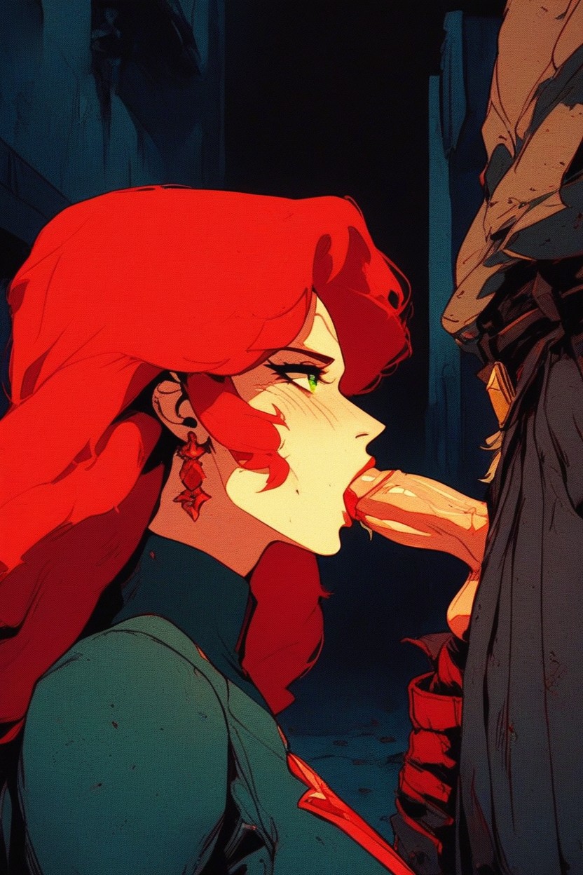 A dark alley in the old town, illuminated by a lamppost. There is a trash can in the middle of the street. Night. A red-haired woman in a long, tunic-like coat with an apple tree pattern is kneeling and giving a blowjob to a man in an aristocratic suit. She has straight shoulder-length hair and green eyes. QueenComplex style