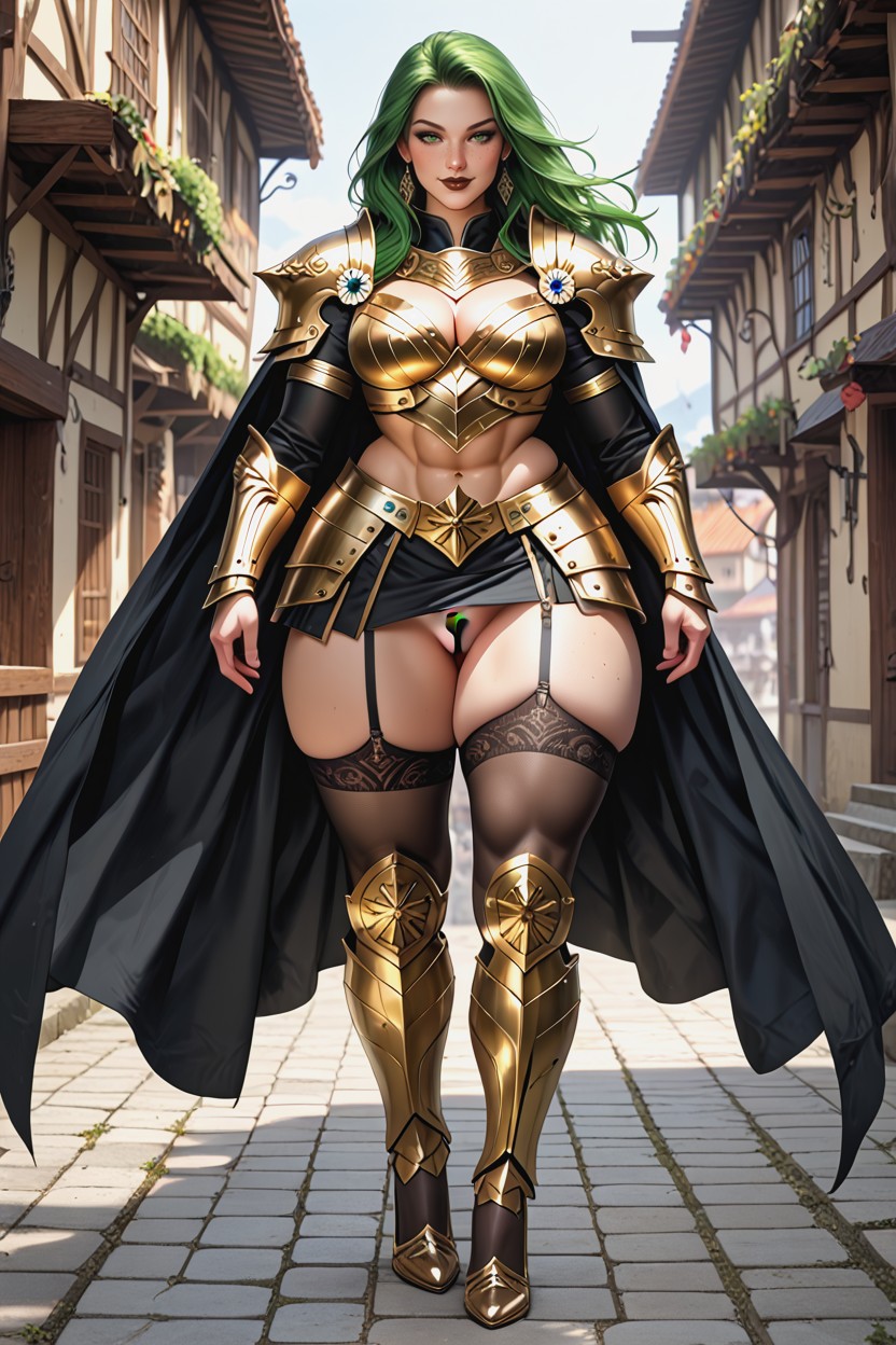 luxanna crownguard, seductive smiling, green hair, long loose hair, long hair, green eyes, brown lipstick, natural breasts, waist, hyper hips, six pack abs, thick thighs, front view, cleavage, thick pussy, pussy vulva, freckles, detailed body, pussy labia, pubic hair, golden armour, black cape, full metal armour, completely armored, skirt, heels, stockings, detailed face, ultra detailed skin, details eye, beautiful eye, almond eye, pupils
