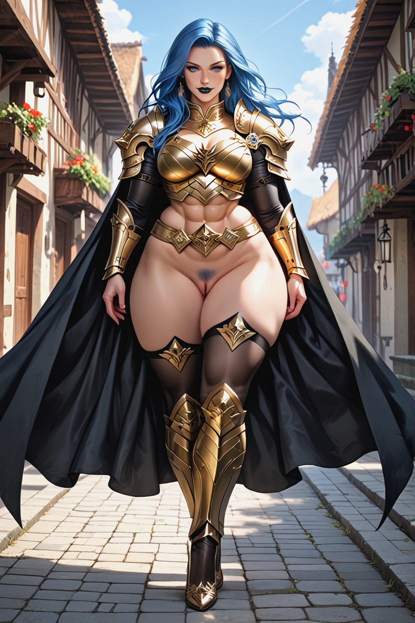 luxanna crownguard, seductive smiling, blue hair, long loose hair, long hair, blue eyes, black lipstick, natural breasts, waist, hyper hips, six pack abs, thick thighs, front view, cleavage, thick pussy, pussy vulva, freckles, detailed body, pussy labia, pubic hair, golden armour, black cape, full metal armour, completely armored, skirt, heels, stockings, detailed face, ultra detailed skin, details eye, beautiful eye, almond eye, pupils
